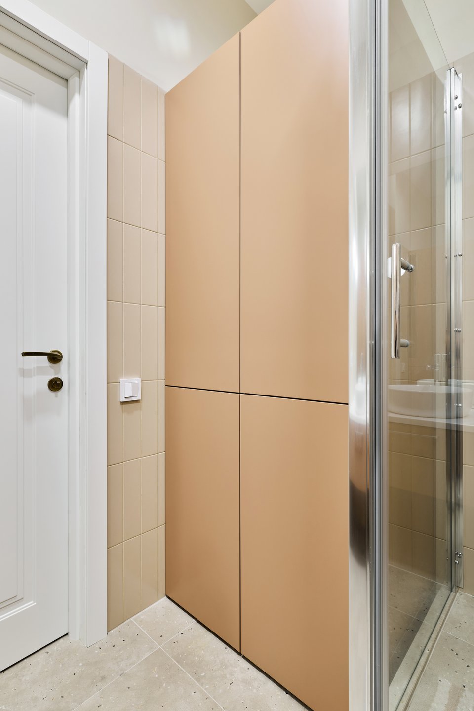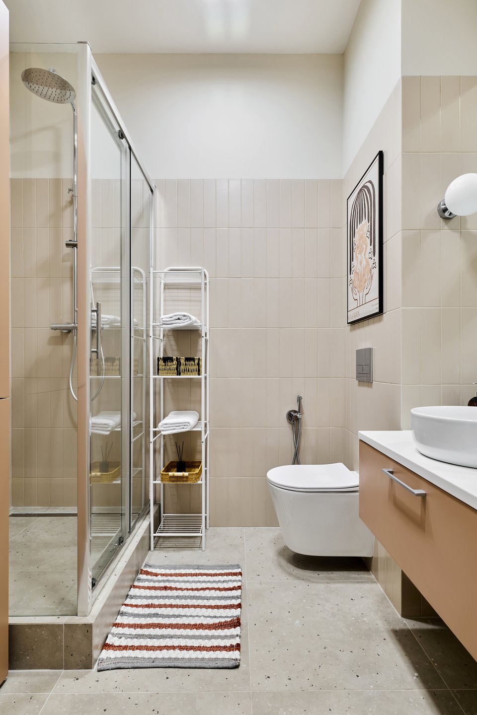По просьбе заказчика в санузле установили душевую кабину. Она освободила место для шкафа под стирально‑сушильную машину и бытовую химию, стеллажа с полками для парфюмерии и полотенец (открытое хранение) и тумбы с выкатным ящиком. В качестве акцента для санузла выбрали карамельный оттенок.
