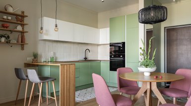 Угловой кухонный гарнитур выполнен на заказ в классическом сочетании цветов: белом и сером. «Это базовые оттенки, которые будут актуальны и через десяток лет, — комментируют дизайнеры. — Верхние белые фасады выглядят свежо и невесомо, а нижние перекликаются с темной мебелью и декоративными элементами в квартире. Шкафы-пеналы со встроенной техникой в цвете “натуральное дерево” делают пространство по-домашнему теплым и уютным».