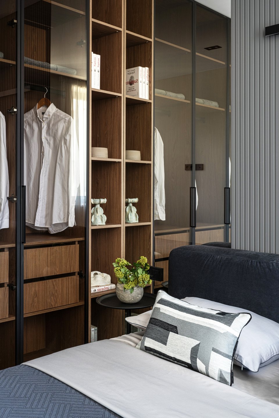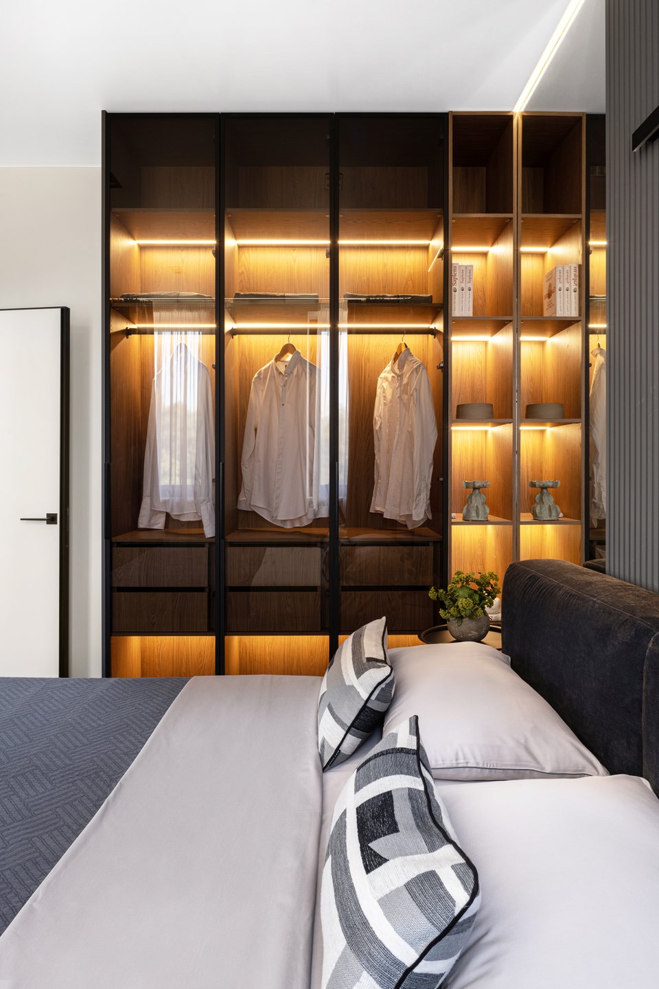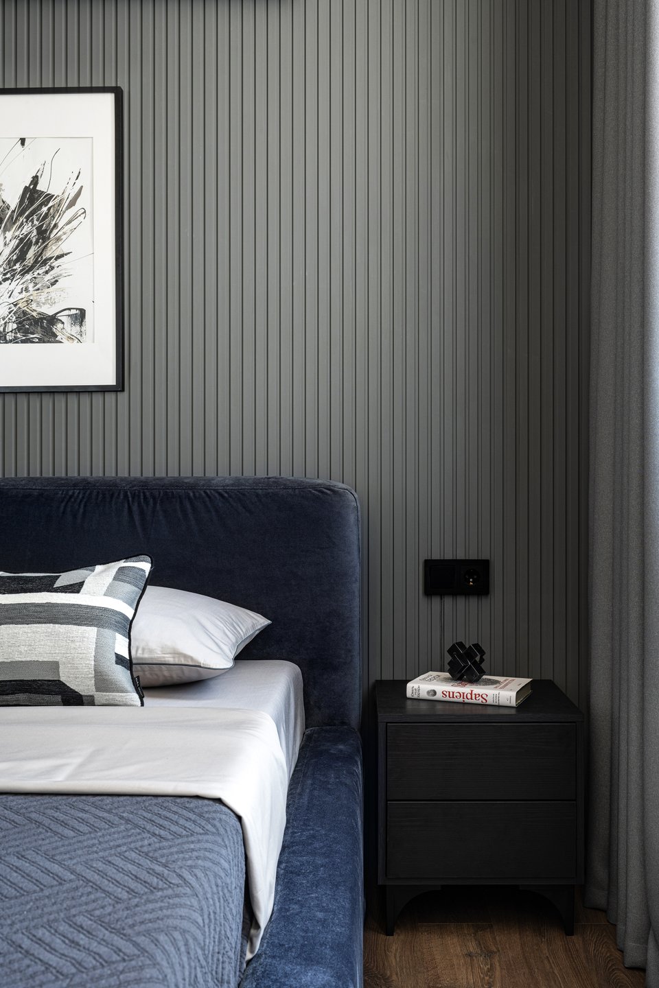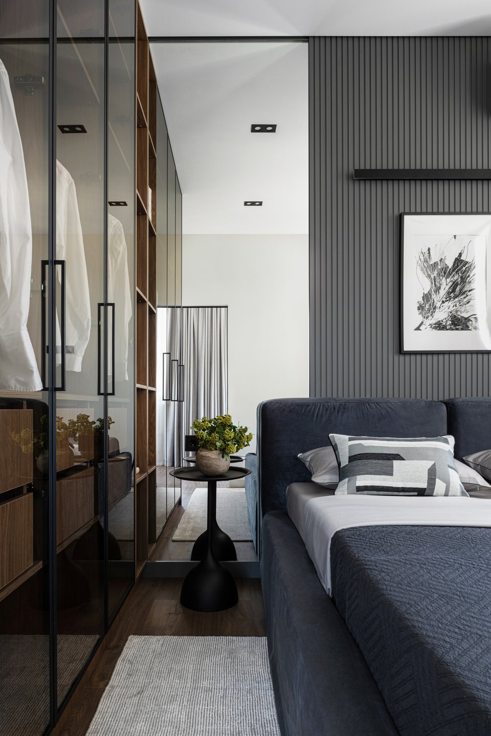 Нейтральную обстановку в спальне «оживили» фактурными панелями за изголовьем. В центре внимания здесь — комфортная мягкая кровать Фостер от divan.ru. Систему хранения с прозрачными дверцами и подсветкой изготовили на заказ.
