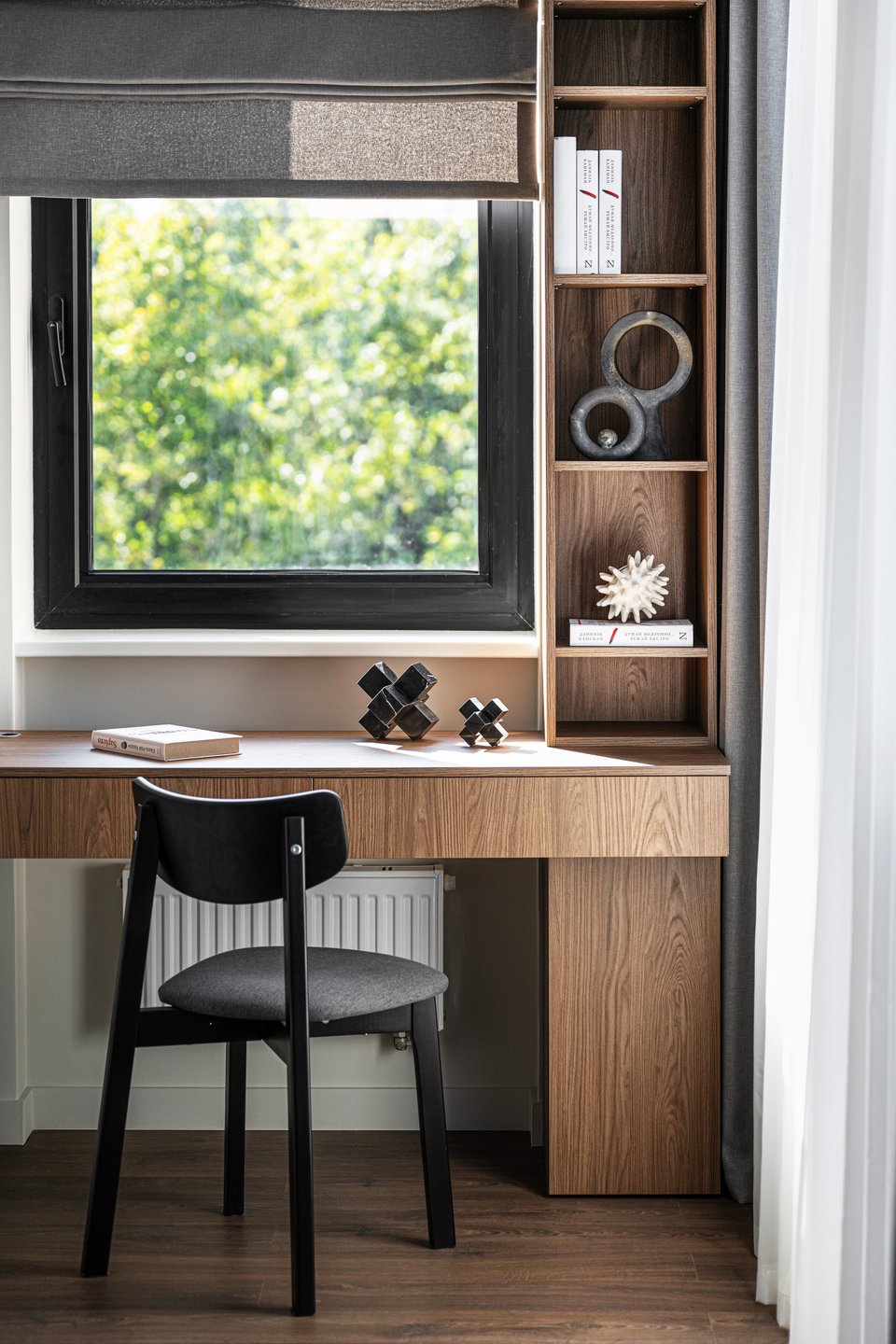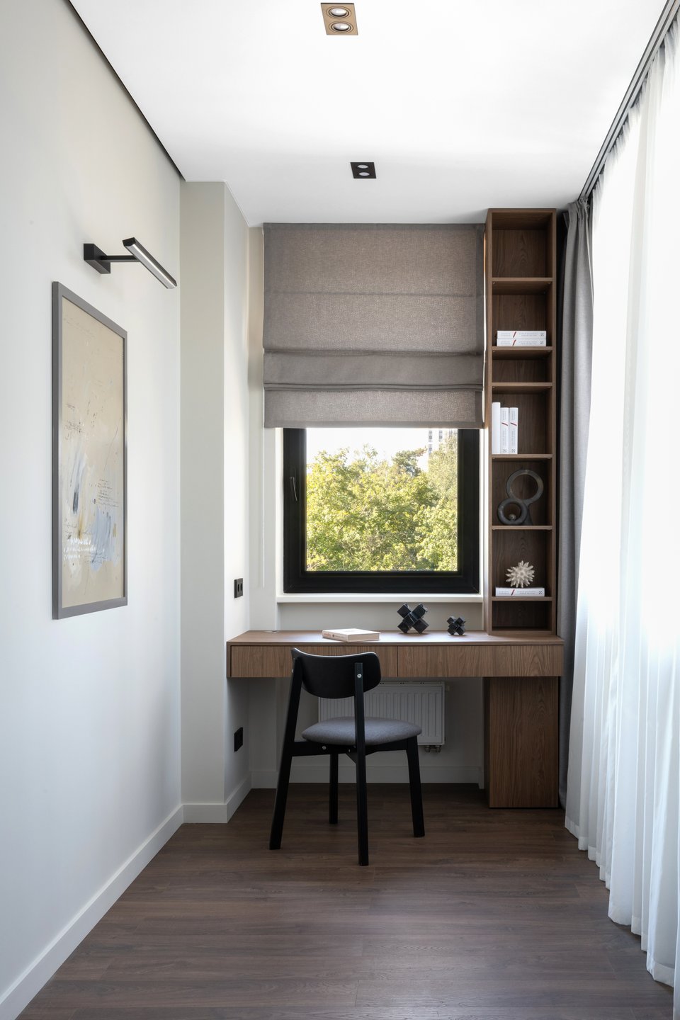 Рабочее место расположили у окна, в «тупике». В будущем это пространство может стать детской. Стол с интегрированным в него стеллажом изготовили на заказ.