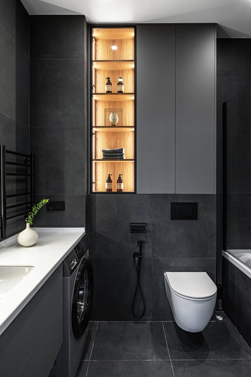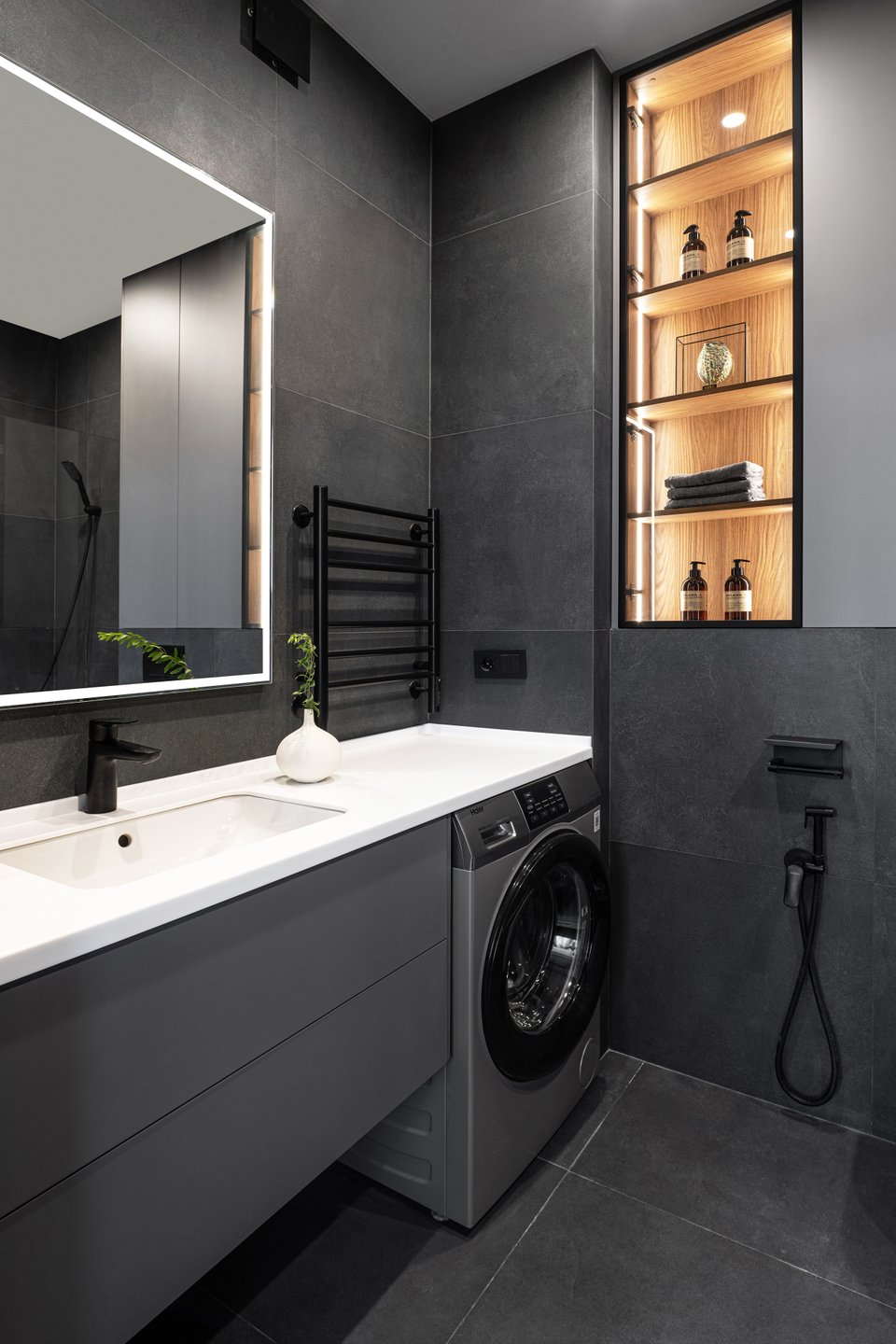 Стены и пол в совмещенном санузле облицевали керамогранитом под бетон. На небольшой площади удалось разместить ванну, унитаз с инсталляцией, стиральную машину и тумбу с раковиной под общей столешницей, открытые полки с подсветкой для хранения.