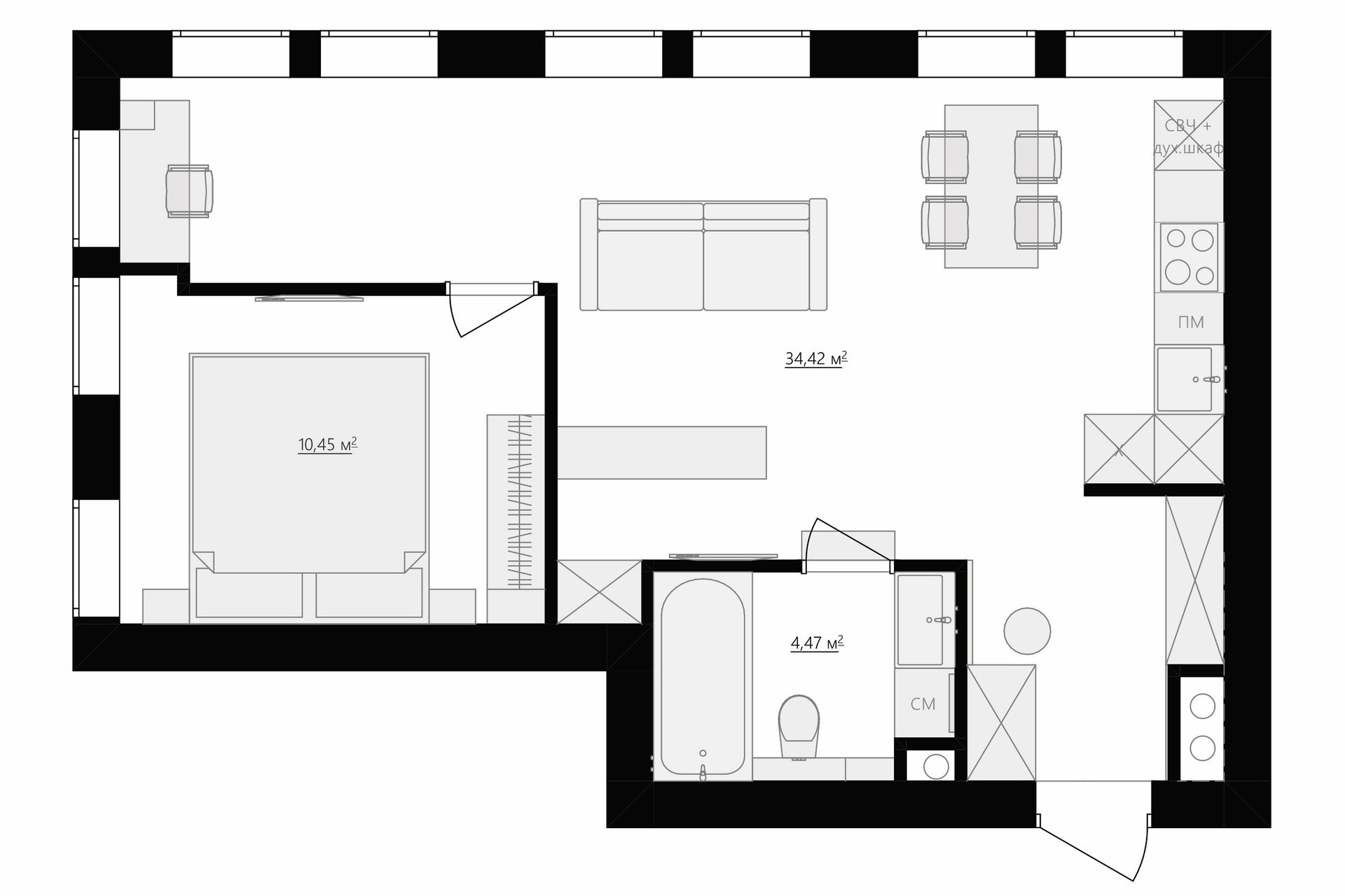 Основная задача этого проекта — создать «гибкое» пространство, которое будет актуальным не только для холостяка, но и для молодой семьи в будущем.