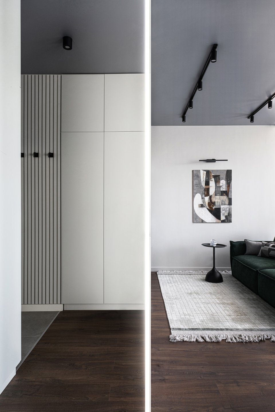 Входную зону выделили серым керамогранитом, потолок выдержан в том же оттенке. Вместительный шкаф высотой до потолка сливается по цвету со стеной и не выглядит громоздким.