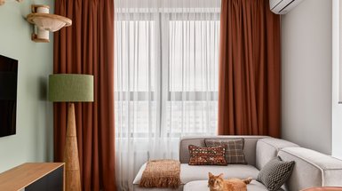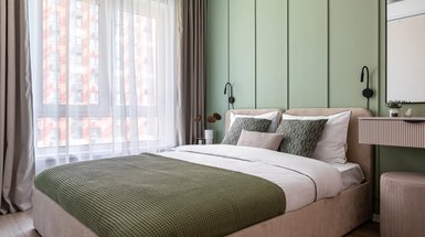 В спальне три стены оклеили кремовыми обоями, а четвертую выделили яркими зелеными. Обивку двуспальной кровати Шерона от divan.ru заказали терракотового цвета. «Благодарна заказчикам, что не побоялись ярких цветов и не ушли в скучный беж, — комментирует автор проекта. — Такая спальня априори заряжает на хорошее настроение».