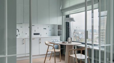 Для фартука этой кухни-гостиной выбрали стеклянную панель, которая имеет массу преимуществ. Материал славится невысокой стоимостью и практичностью — в отличие от плитки, во швах которой может скапливаться грязь, однородное стекло легко моется. Прозрачный фартук защищает светлую отделку стен и добавляет «воздуха» в оформление кухонной зоны.