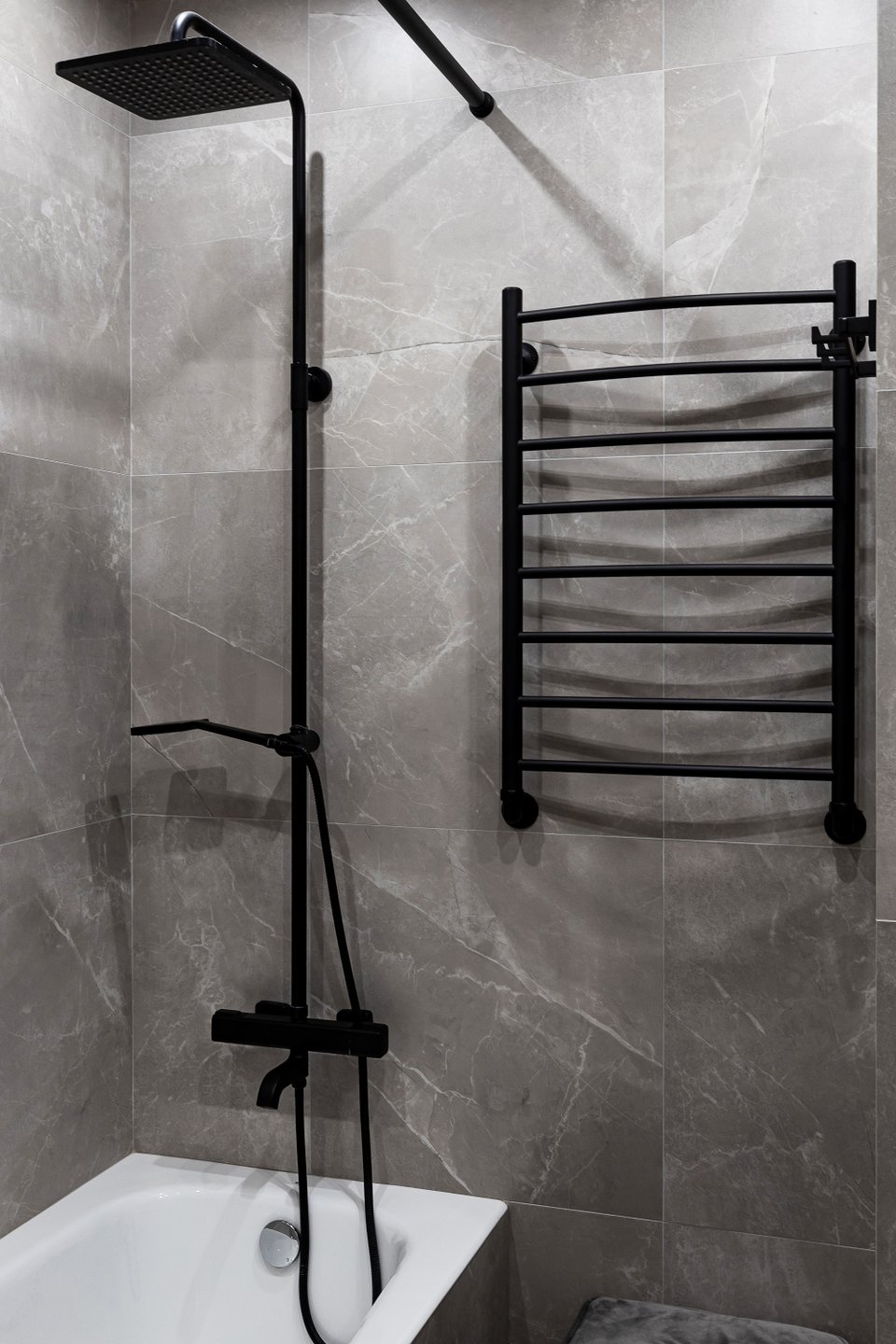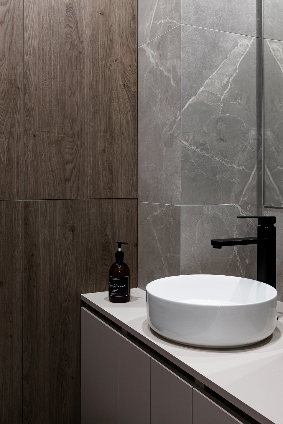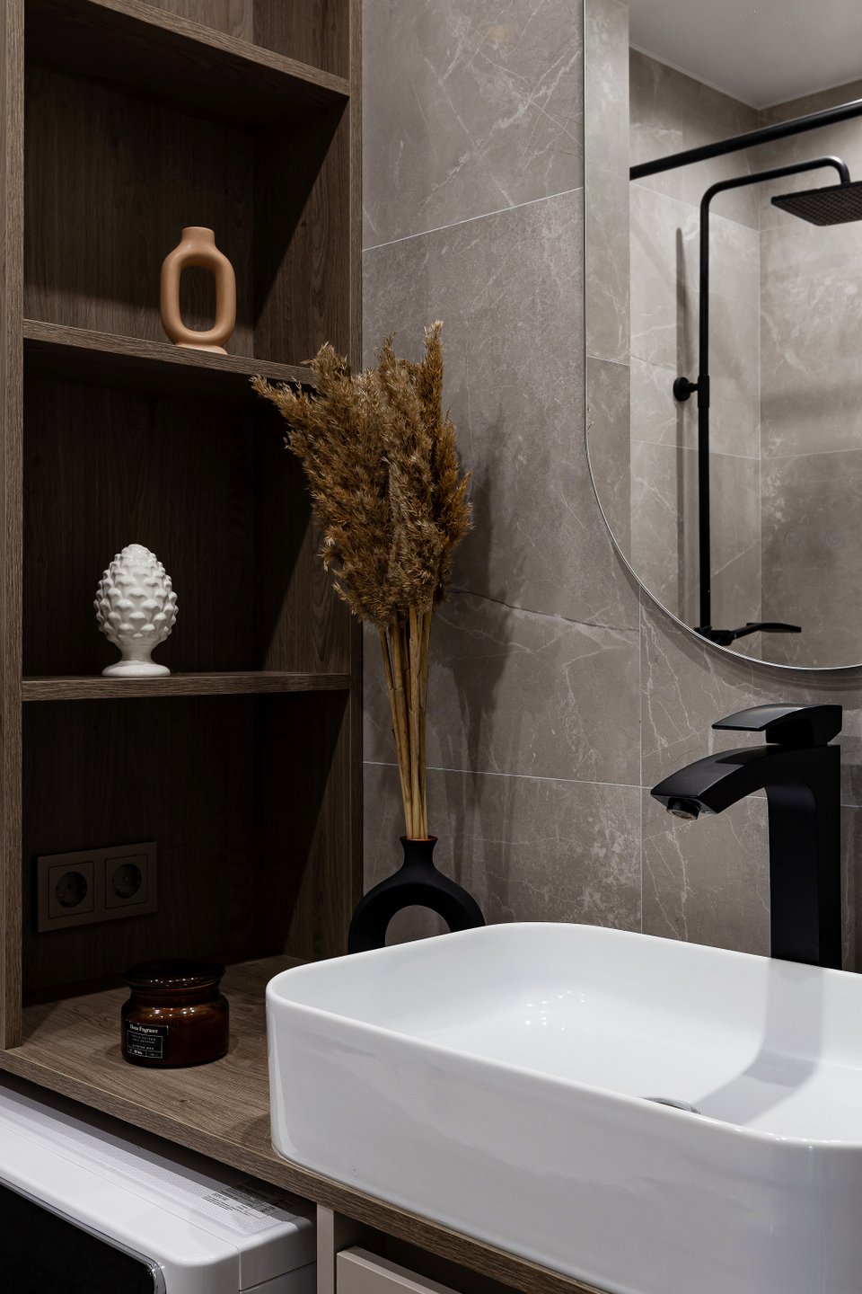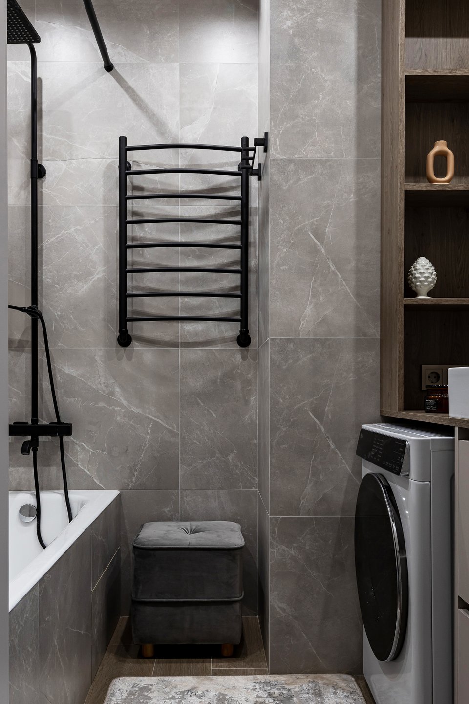 Сложность при планировании ванной комнаты представлял угол вентиляционной шахты. В имеющейся нише разместили тумбу с раковиной, стиральную машину и шкаф с открытыми полками для хранения. У противоположной стены установили ванну. В туалете нашлось место для тумбы с раковиной. Оба помещения оформили одинаково: на стенах — серый керамогранит под мрамор, шкафы выполнены из ЛДСП цвета темного дерева.