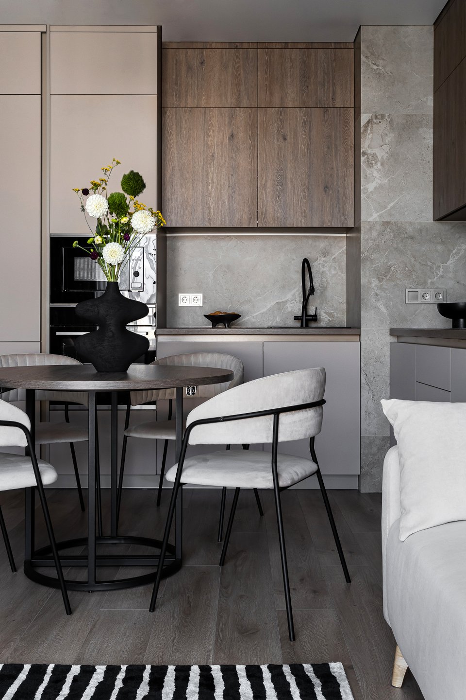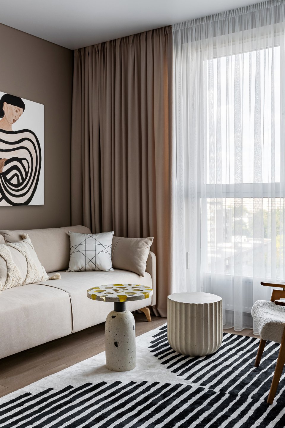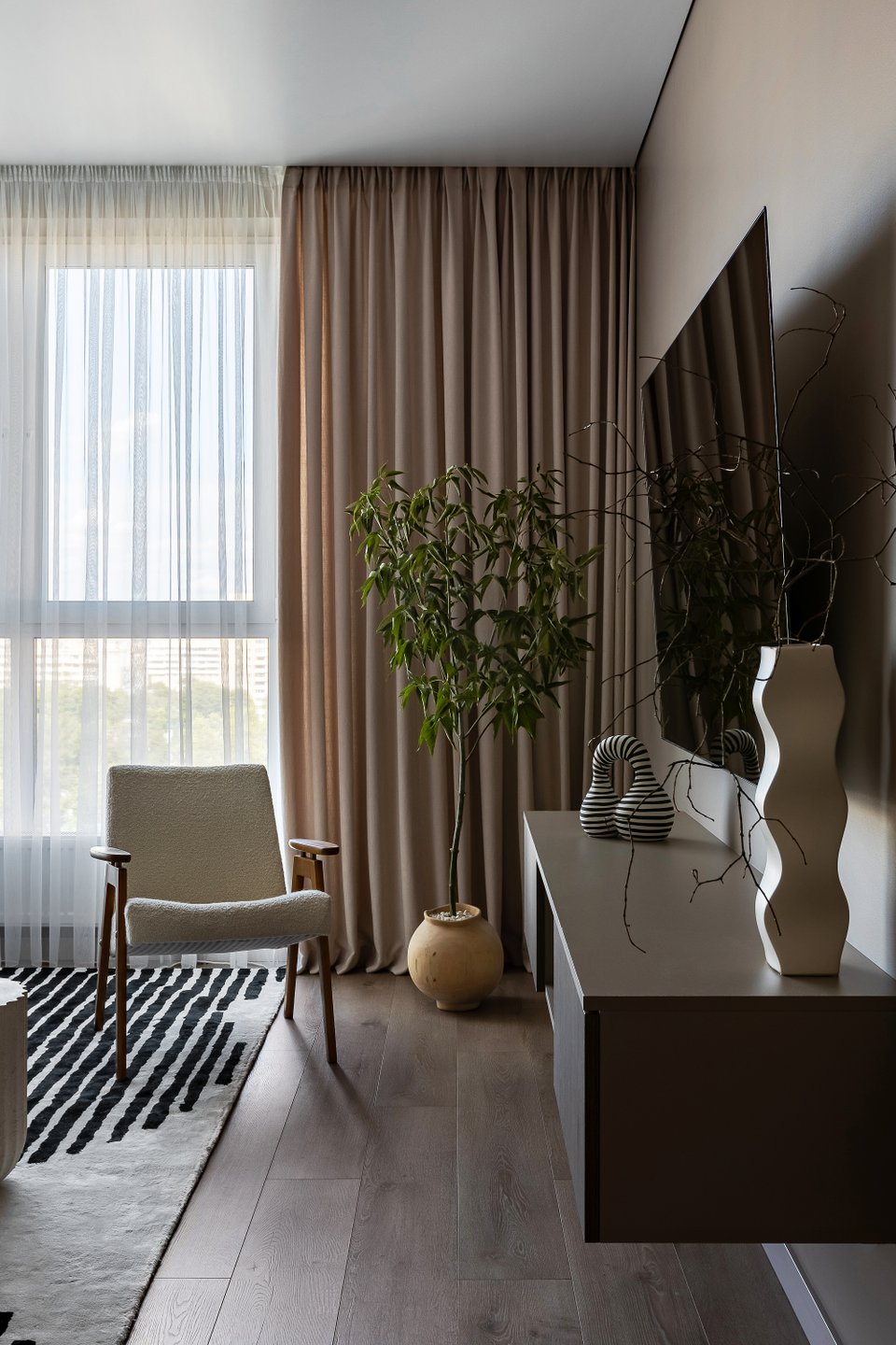 «Окна квартиры выходят на северо-запад, естественного света здесь недостаточно, — рассказывают дизайнеры. — Поэтому в качестве базы мы выбрали мягкие бежевые и молочные оттенки. Графичные акценты оживляют современный монохром и добавляют динамики. Элементы графики присутствуют в ковре, картине, черных акцентах мебели. В интерьере активно используется дерево — деревянные панели хорошо сочетаются с зеркалами, которые визуально расширяют пространство. За настроение отвечают текстиль и декор в азиатском стиле. Такое пространство способно адаптироваться к настроению жильцов, при этом долго оставаясь актуальным и современным».