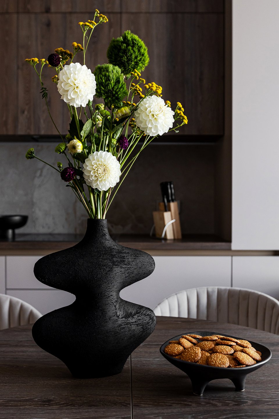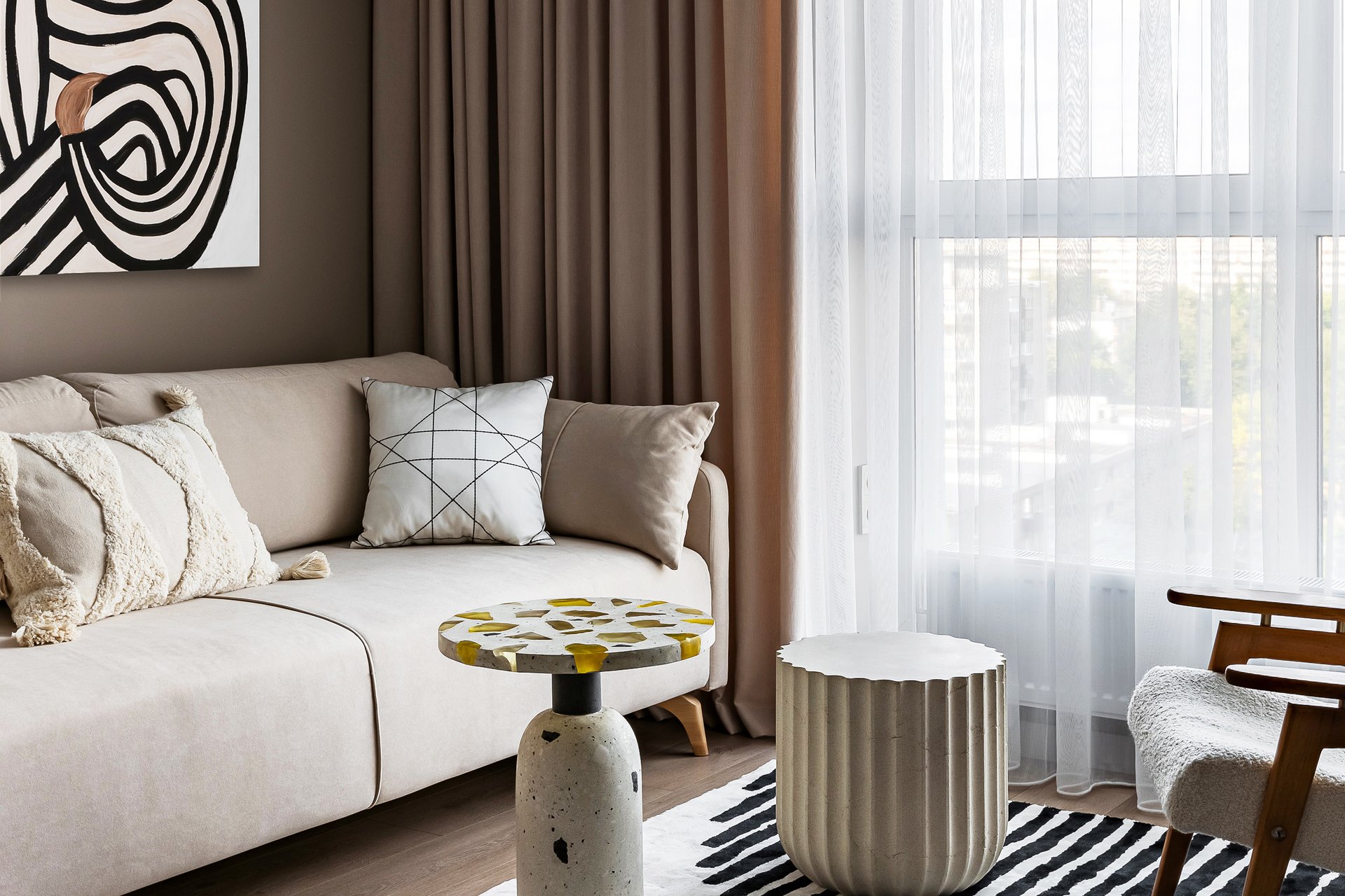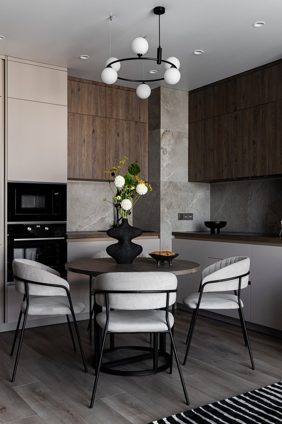 «Окна квартиры выходят на северо-запад, естественного света здесь недостаточно, — рассказывают дизайнеры. — Поэтому в качестве базы мы выбрали мягкие бежевые и молочные оттенки. Графичные акценты оживляют современный монохром и добавляют динамики. Элементы графики присутствуют в ковре, картине, черных акцентах мебели. В интерьере активно используется дерево — деревянные панели хорошо сочетаются с зеркалами, которые визуально расширяют пространство. За настроение отвечают текстиль и декор в азиатском стиле. Такое пространство способно адаптироваться к настроению жильцов, при этом долго оставаясь актуальным и современным».