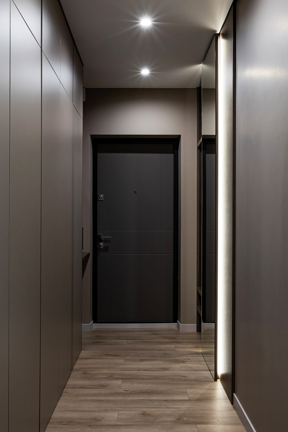 В прихожей спроектировали распашной шкаф с отделениями для верхней одежды, хозяйственного инвентаря и бытовой техники. Фасады шкафа выкрашены в цвет стен — так габаритная мебель не загромождает пространство и не создает визуальный шум.