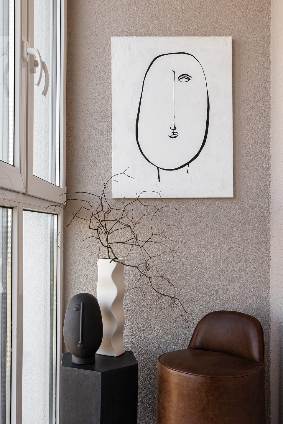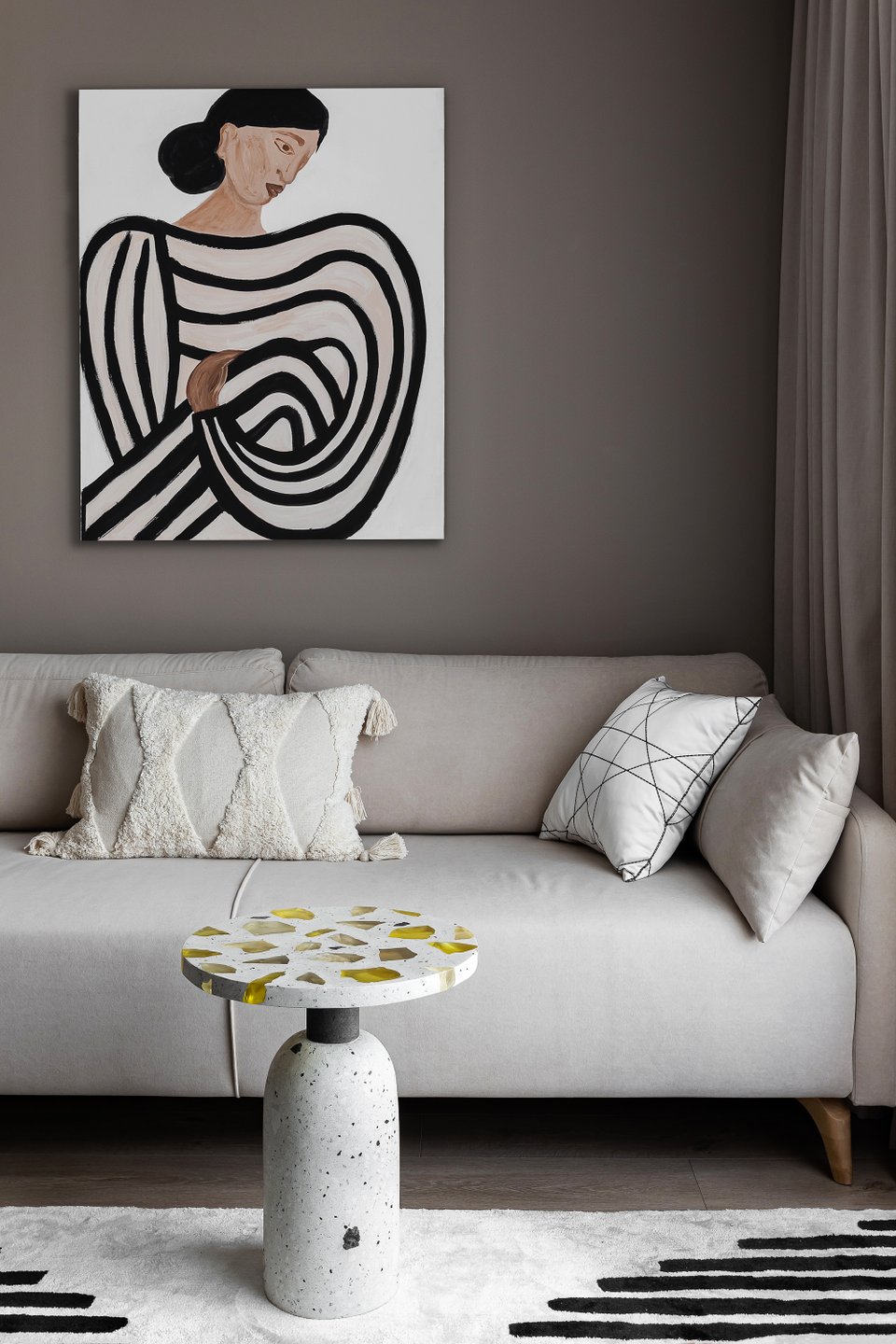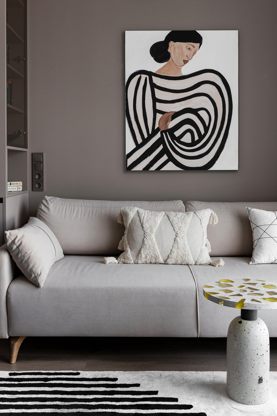 История этого интерьера началась с картины, которую одна из дизайнеров написала специально для проекта. Именно благодаря ей родилась концепция монохромного пространства, где во главе стоит графичность линий.