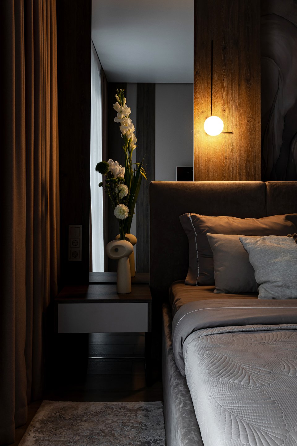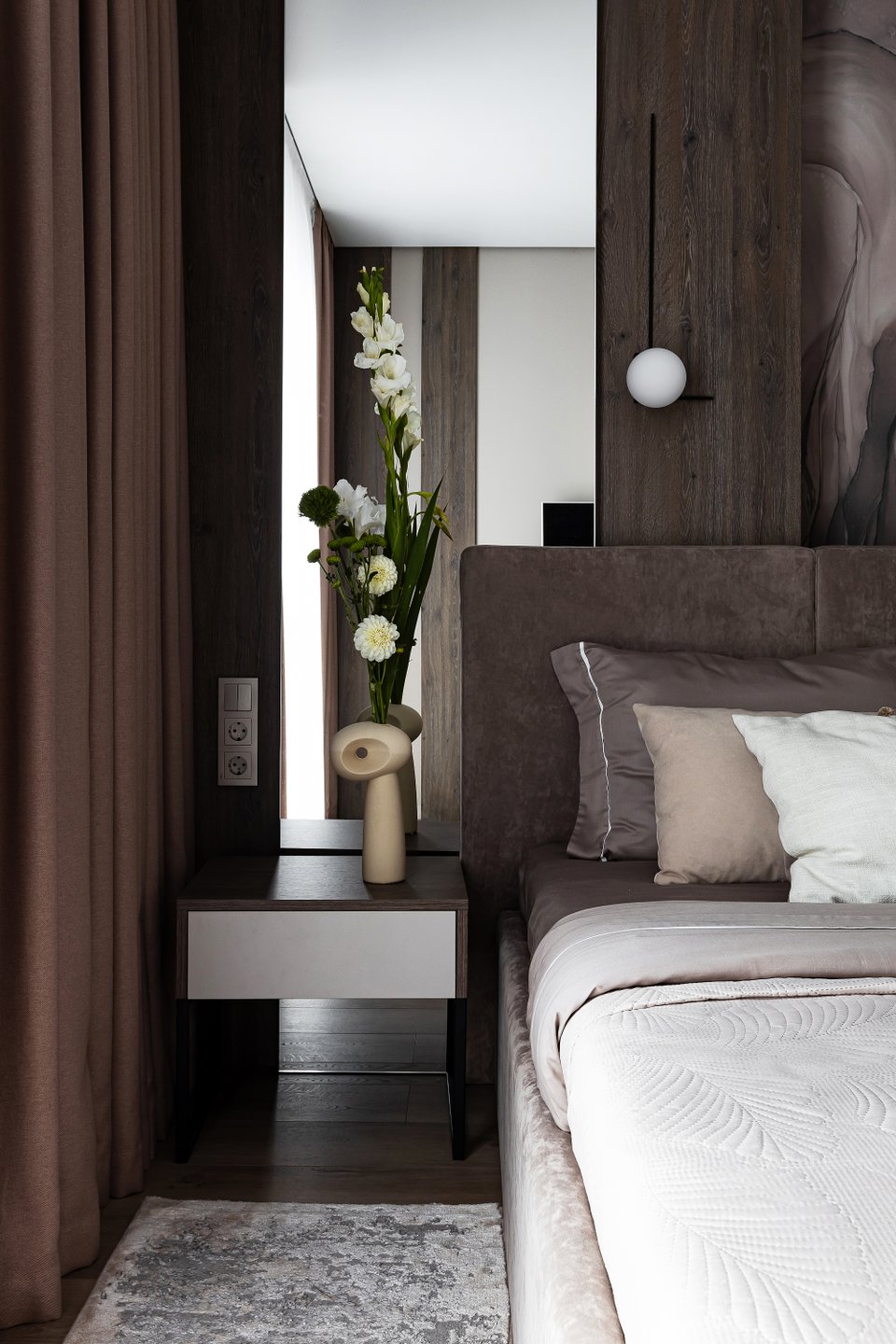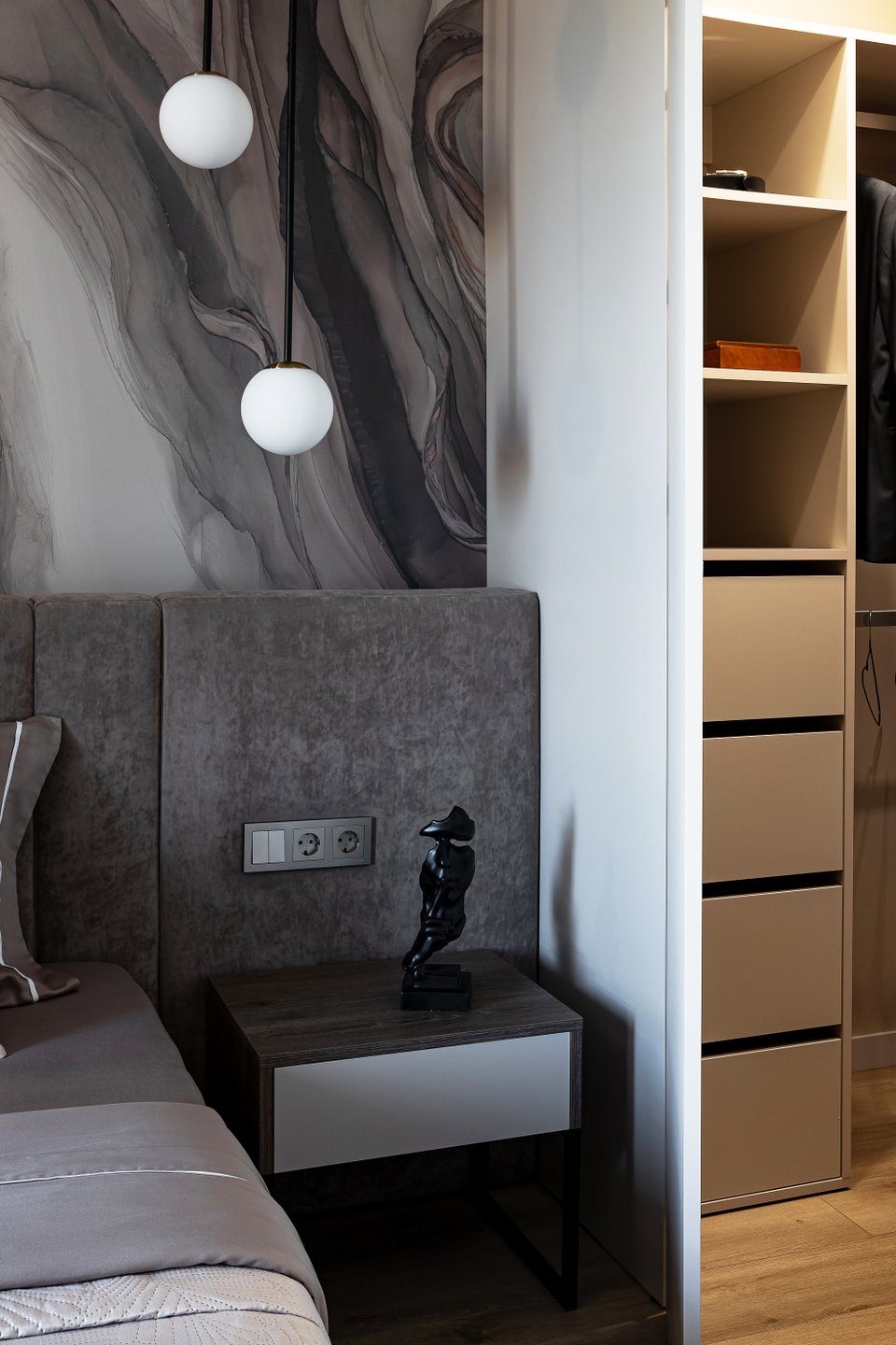 Неправильную форму спальни обыграли с помощью зеркал и асимметричного изголовья кровати. Строгие формы помещения «смягчили» с помощью фрески. В нише, предусмотренной на этапе ремонта, обустроили гардеробную.