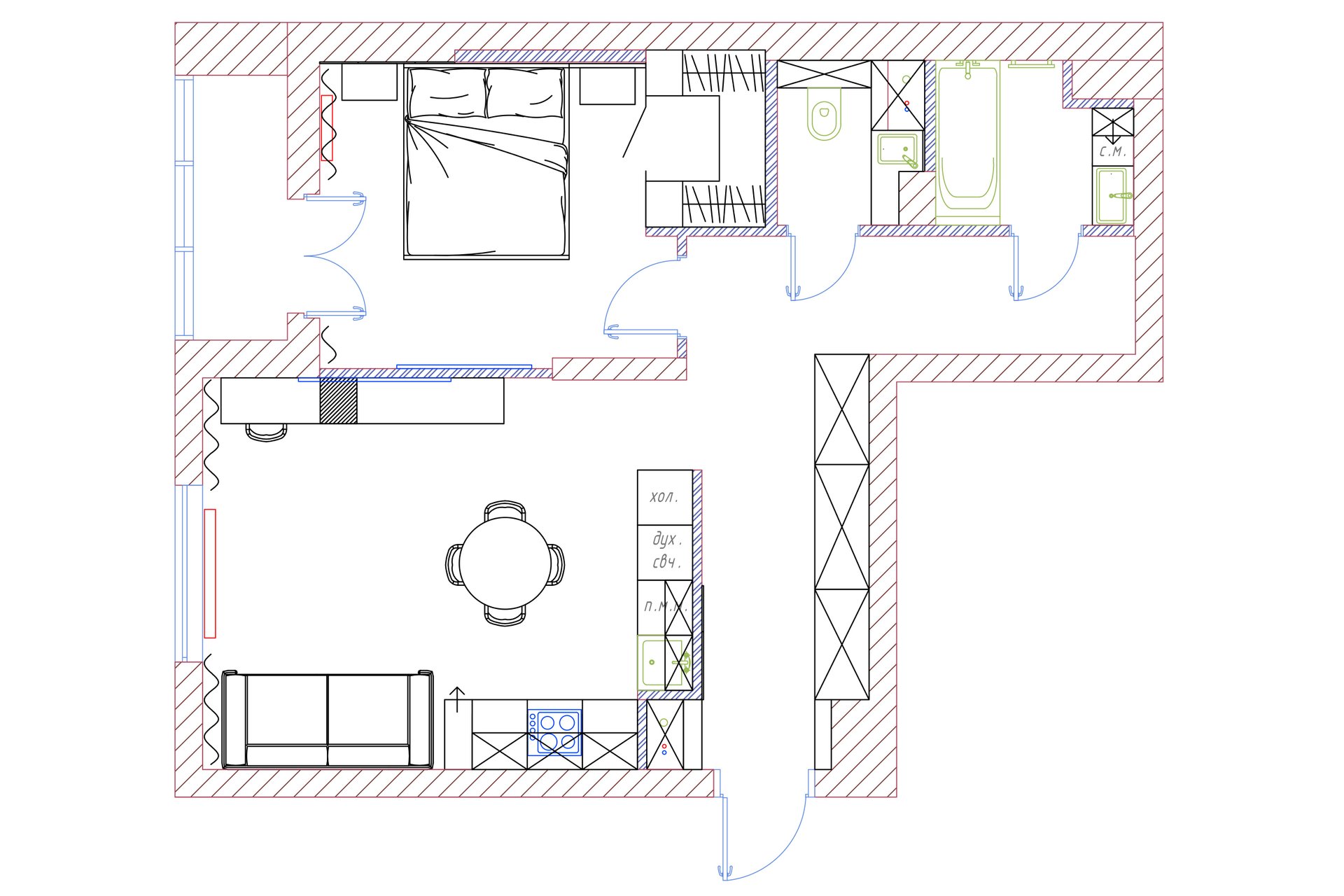 - Организовать зону прихожей с множеством мест хранения и просторную кухню-гостиную.