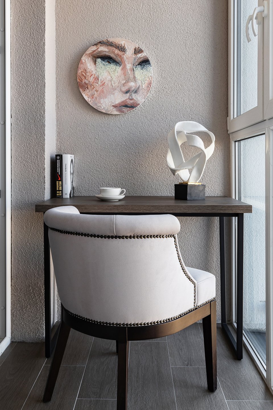 Балкон оформили в тех же оттенках, что и остальной интерьер. На момент съемки на балконе располагалось рабочее место. В холодное время года стол переносят в гостиную (в ТВ-зону).