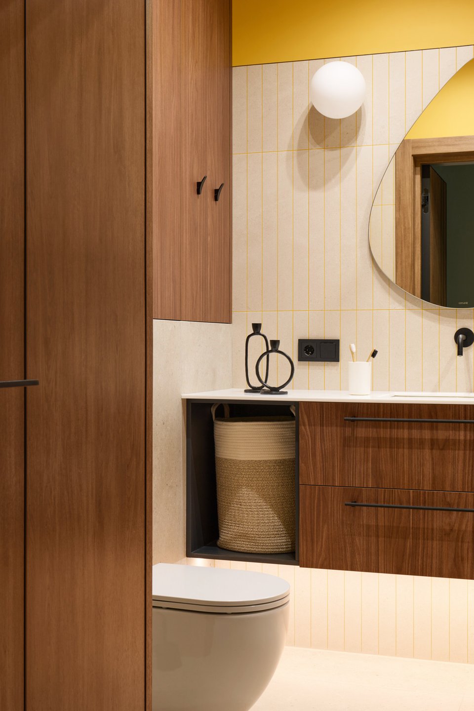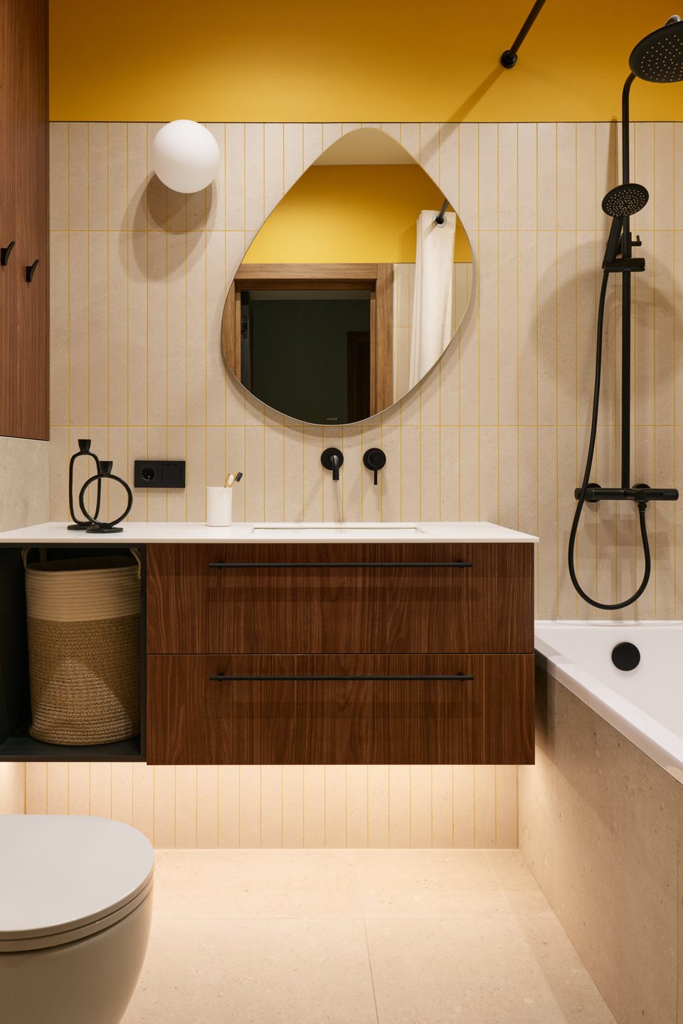 Площадь совмещенного санузла всего 3,5 кв.м, но от ярких оттенков решили не отказываться. Здесь это акцентная затирка и желтая краска на стене под потолком. Теплая стена для сушки полотенец и вместительная тумба под раковиной добавили лаконичной функциональности.
