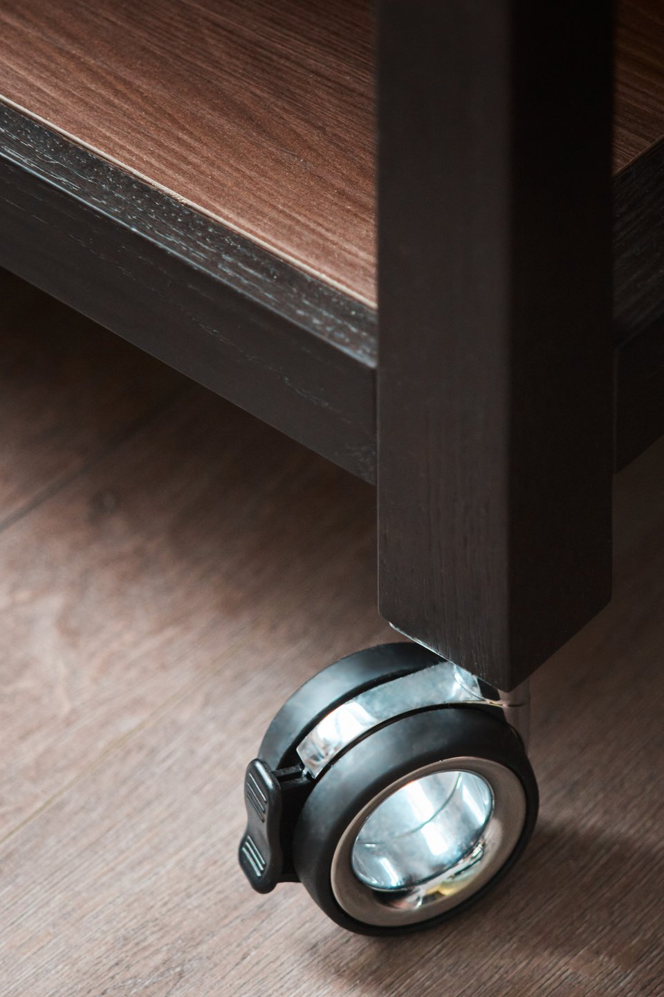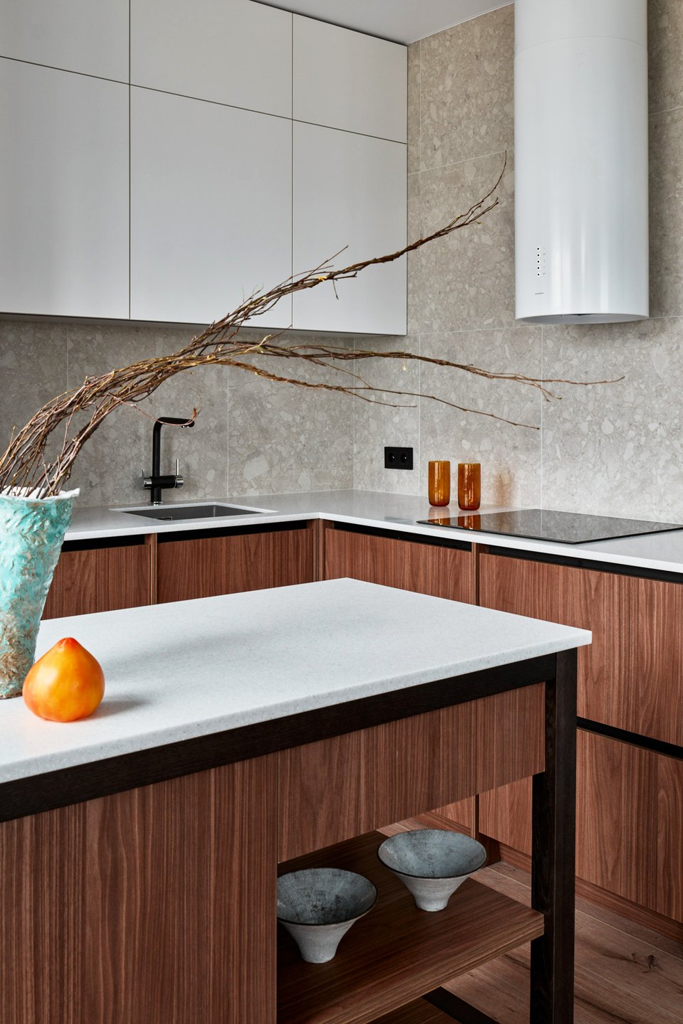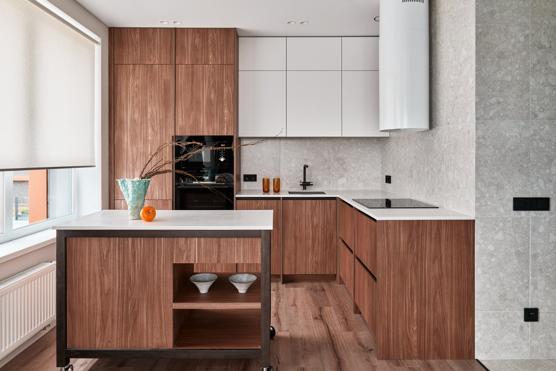 Проблема и решение: одним из пожеланий заказчиков был кухонный остров, но его установке мешал радиатор отопления. Решением стал перекатной остров на колесах. Столешница — дополнительная рабочая поверхность; под островом — открытая система хранения посуды и закрытые ящики (для столовых приборов, овощей, посуды или техники).