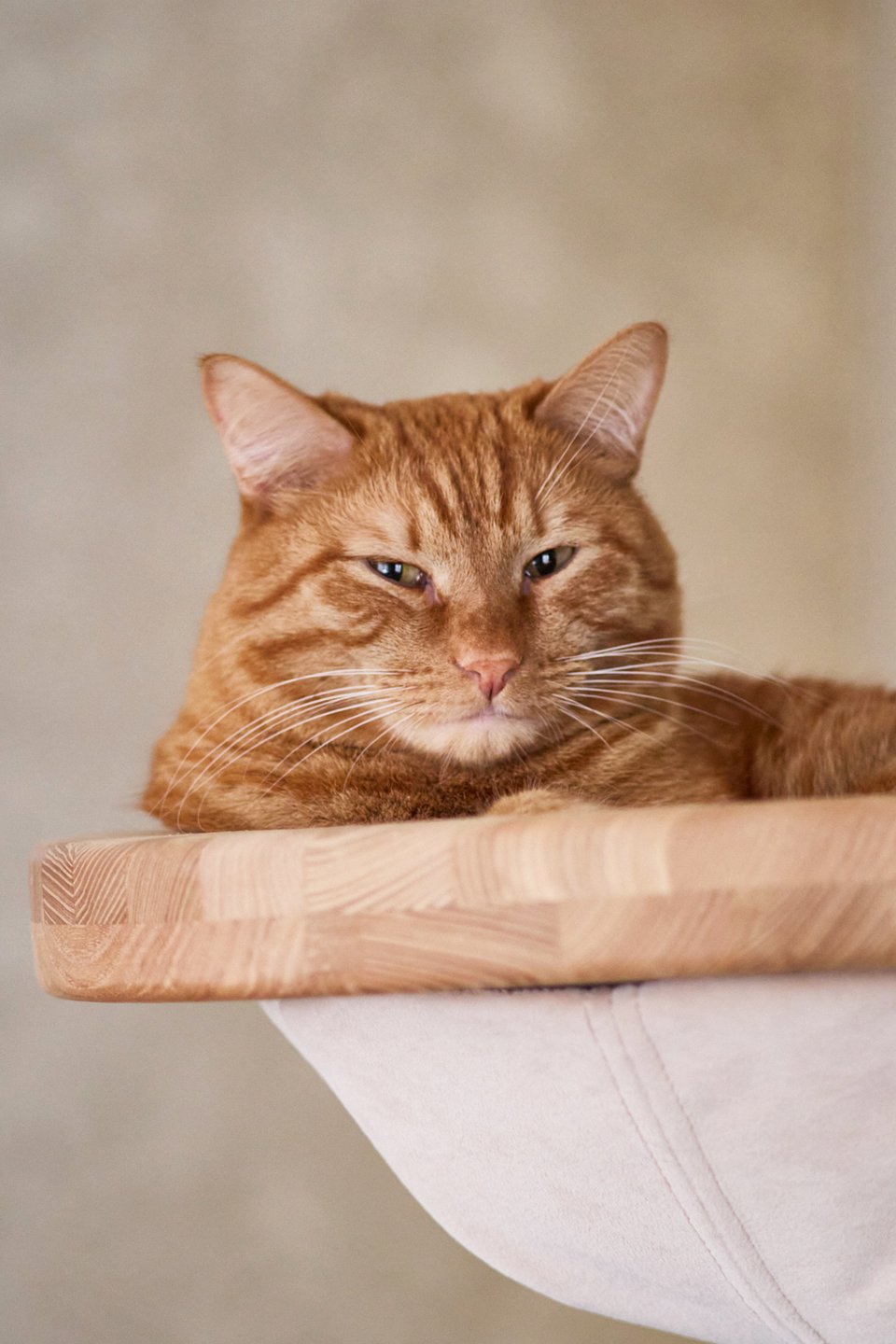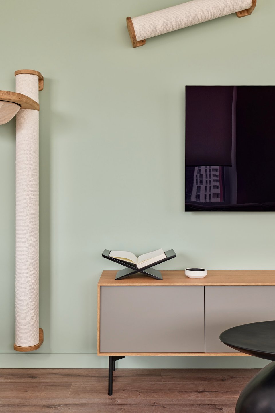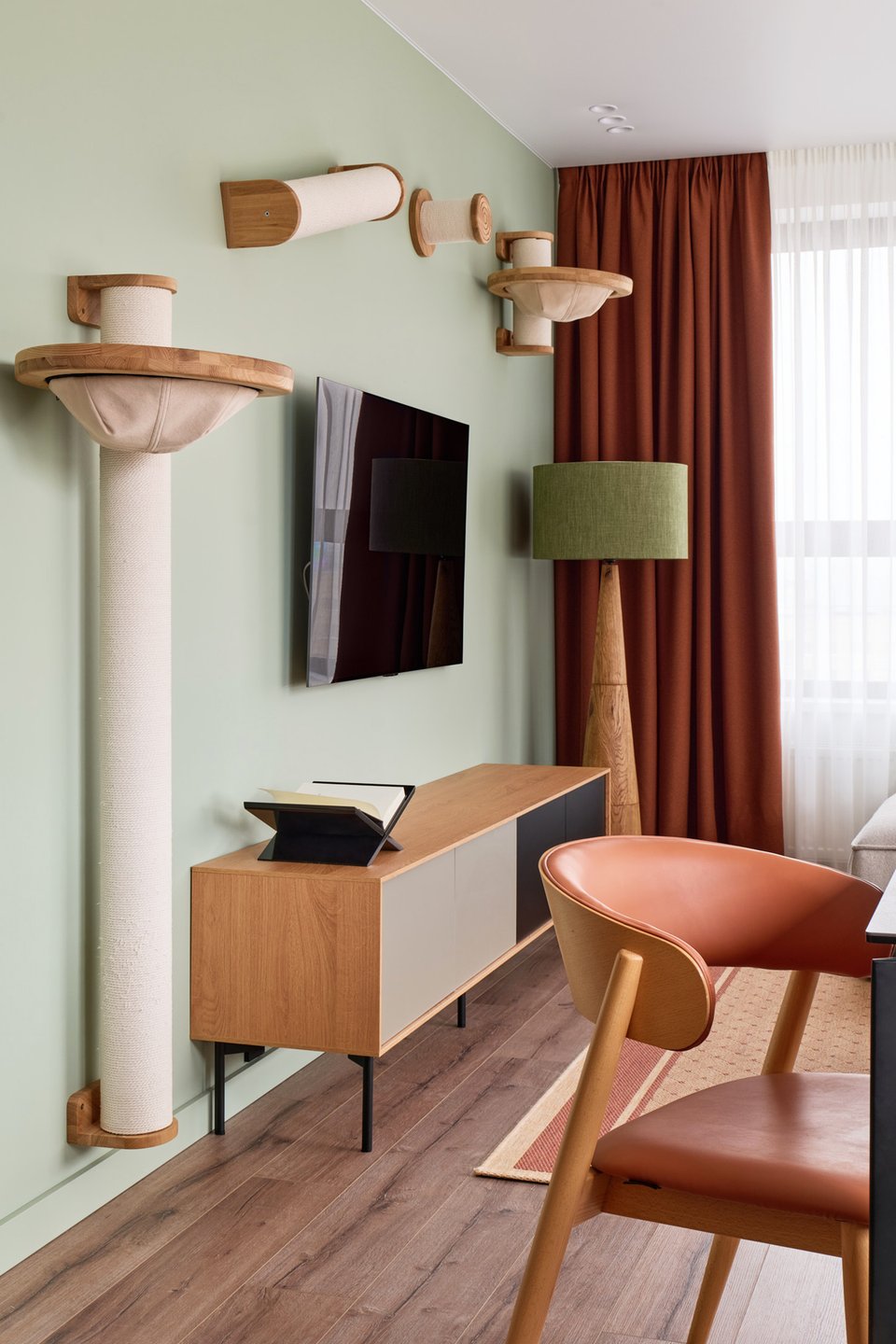 Стены в зоне отдыха отделали декоративной штукатуркой. Гостиную проектировали с учетом того, что в квартире есть еще и кот, и он постоянно рядом с хозяевами. Так в ТВ-зоне появилась система с «тренажерами» для кота и его подвесная лежанка.