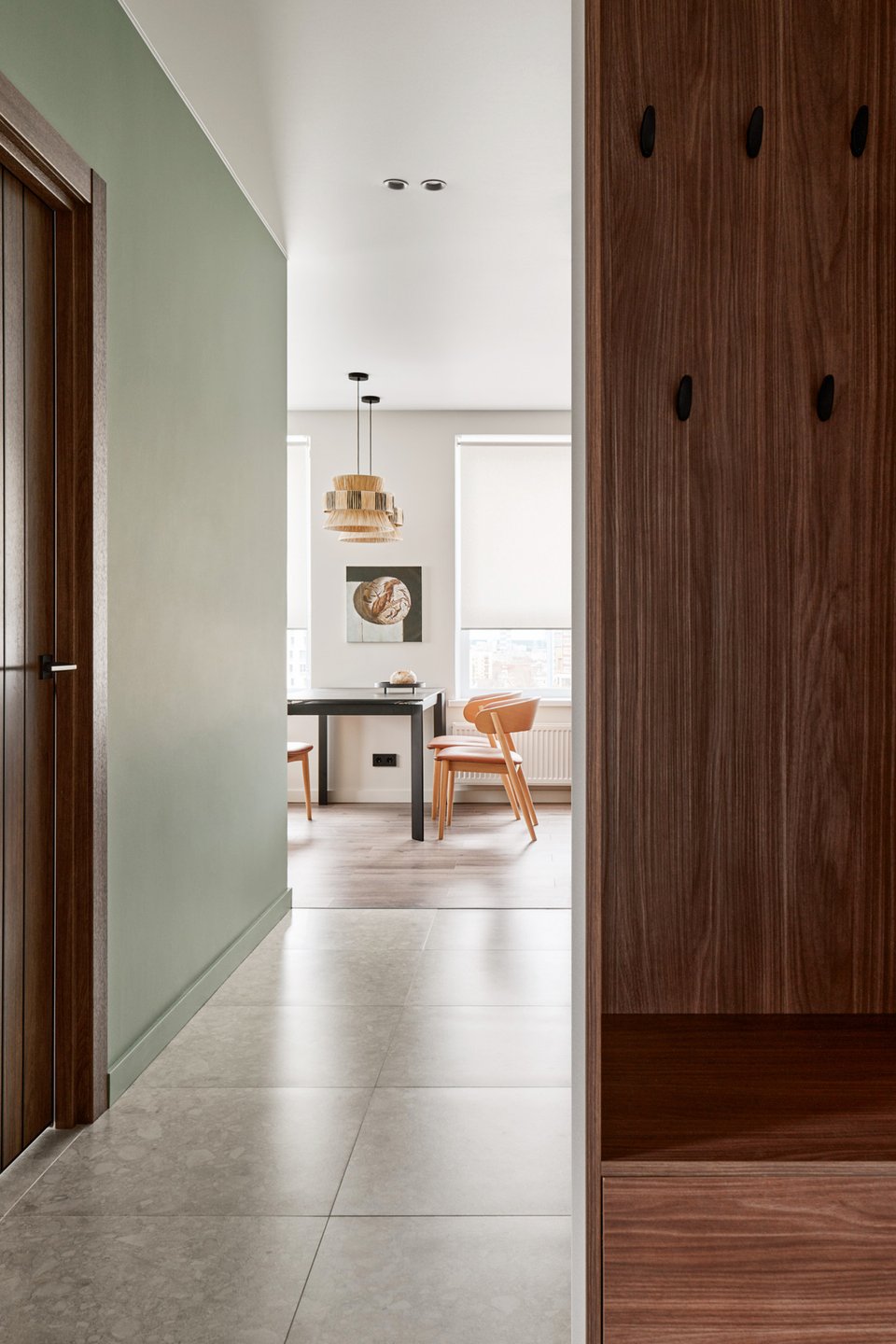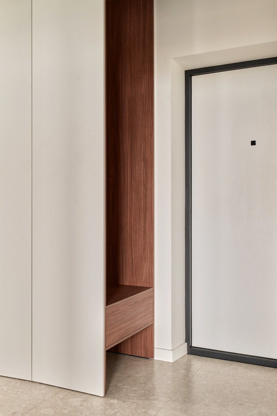 При входе в квартиру спроектировали большой гардеробный шкаф с зеркалом для «расширения» пространства. Внутри — одежда, бытовая техника (стиральная и сушильная машины), хозяйственный блок, место для дополнительных стульев и чемоданов, а также запасы корма и кошачий туалет. Все в доступе, но при этом скрыто.