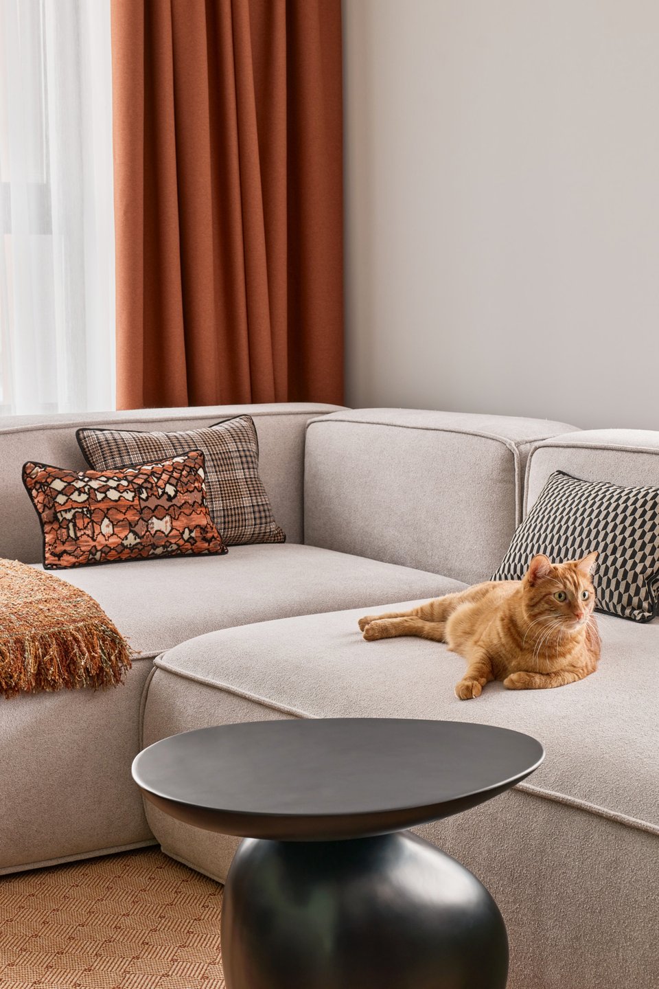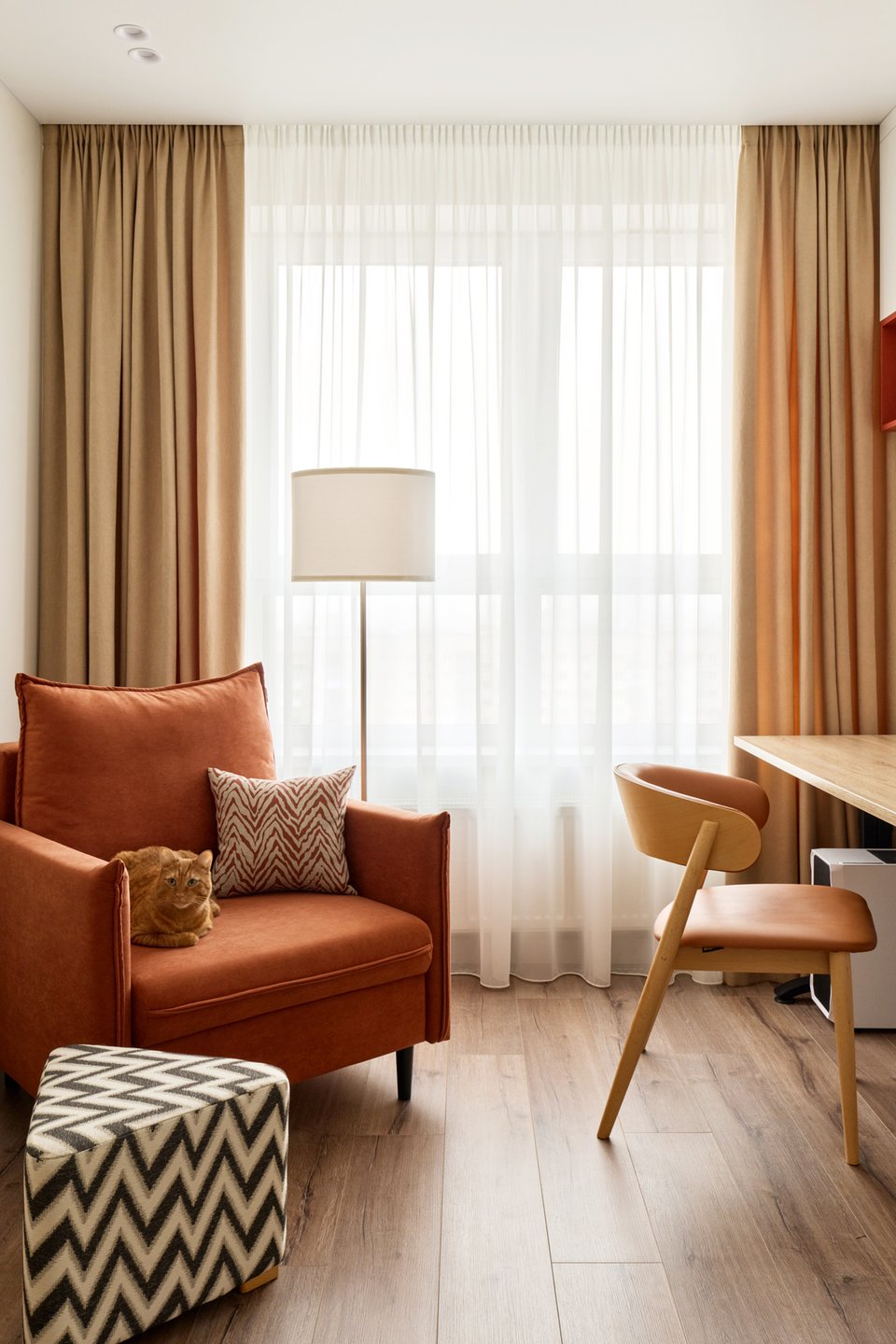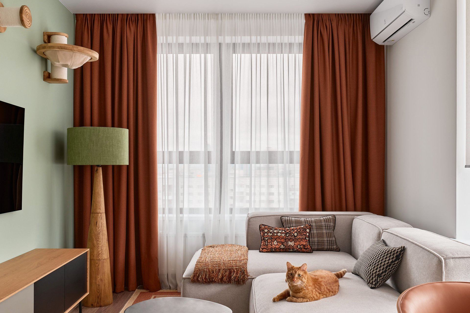 Цветовое решение для этого интерьера в приятной терракотовой гамме «подсказал» питомец хозяев — оттенки для акцентов дизайнер «взяла» с шерстки кота.