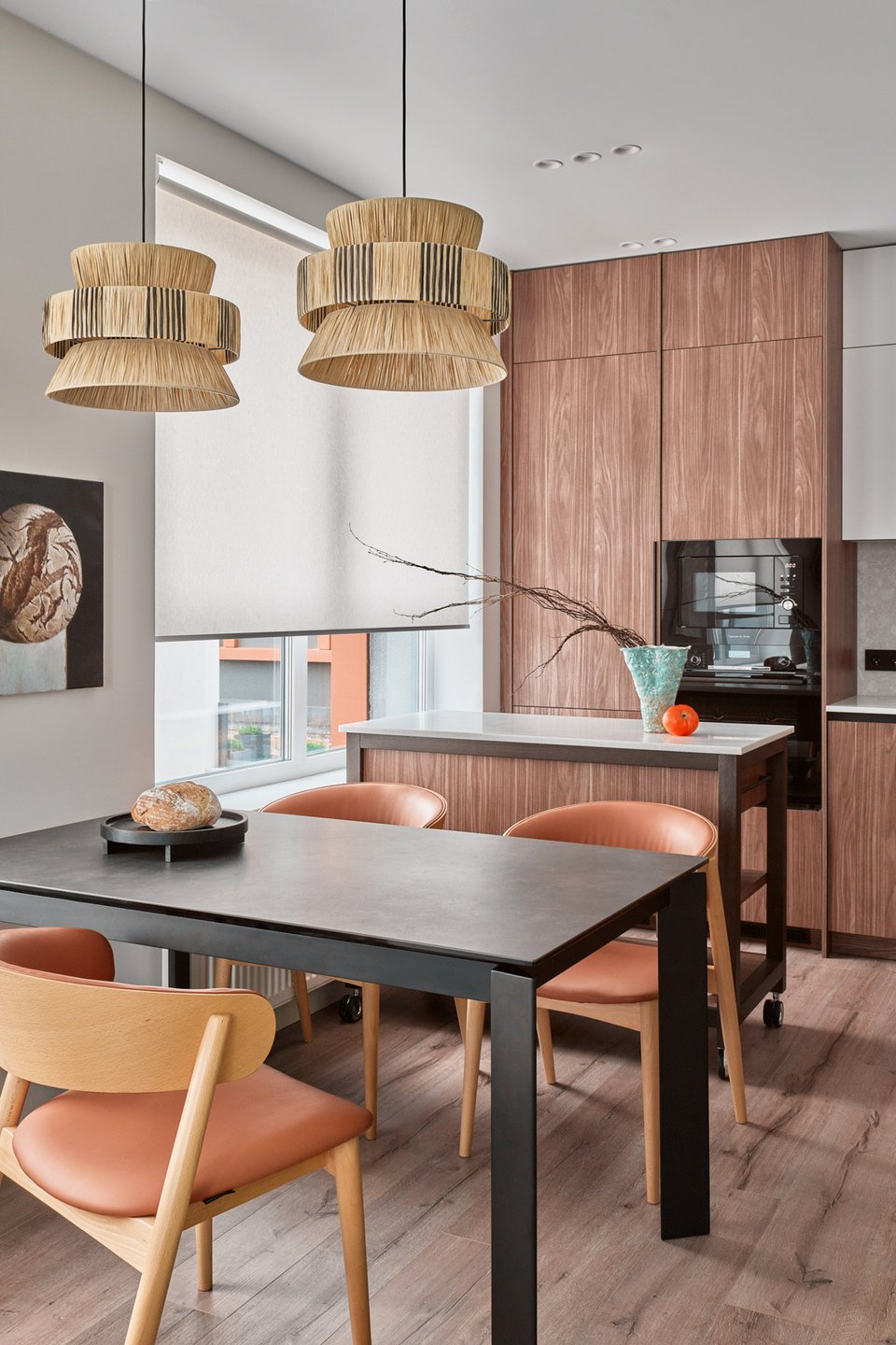 Обеденный стол делит помещение на зоны кухни и гостиной. Эту зону дополнительно выделили подвесными плетеными светильниками.