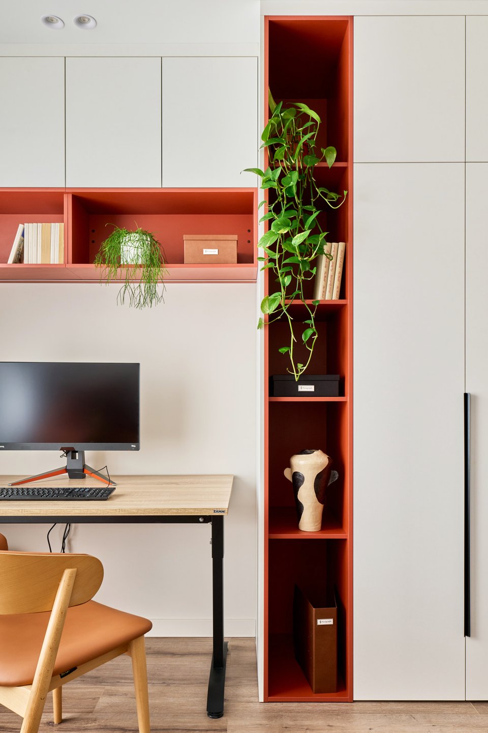 В перспективе кабинет планируют переоборудовать в детскую. Здесь уже подготовлена система хранения под одежду и игрушки. Но пока шкаф используется как дополнительный «взрослый» гардероб. Рабочий стол поднимается и опускается, чтобы можно было работать стоя. На будущее для мамы поставили раскладное кресло Слипсон Мини от divan.ru в терракотовой обивке, а пока это зона отдыха и дополнительное спальное место для гостей.