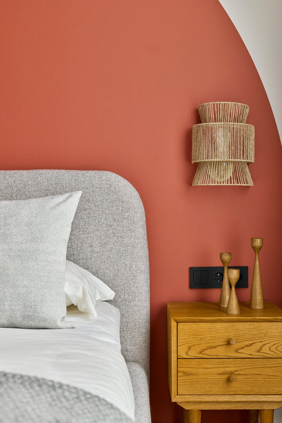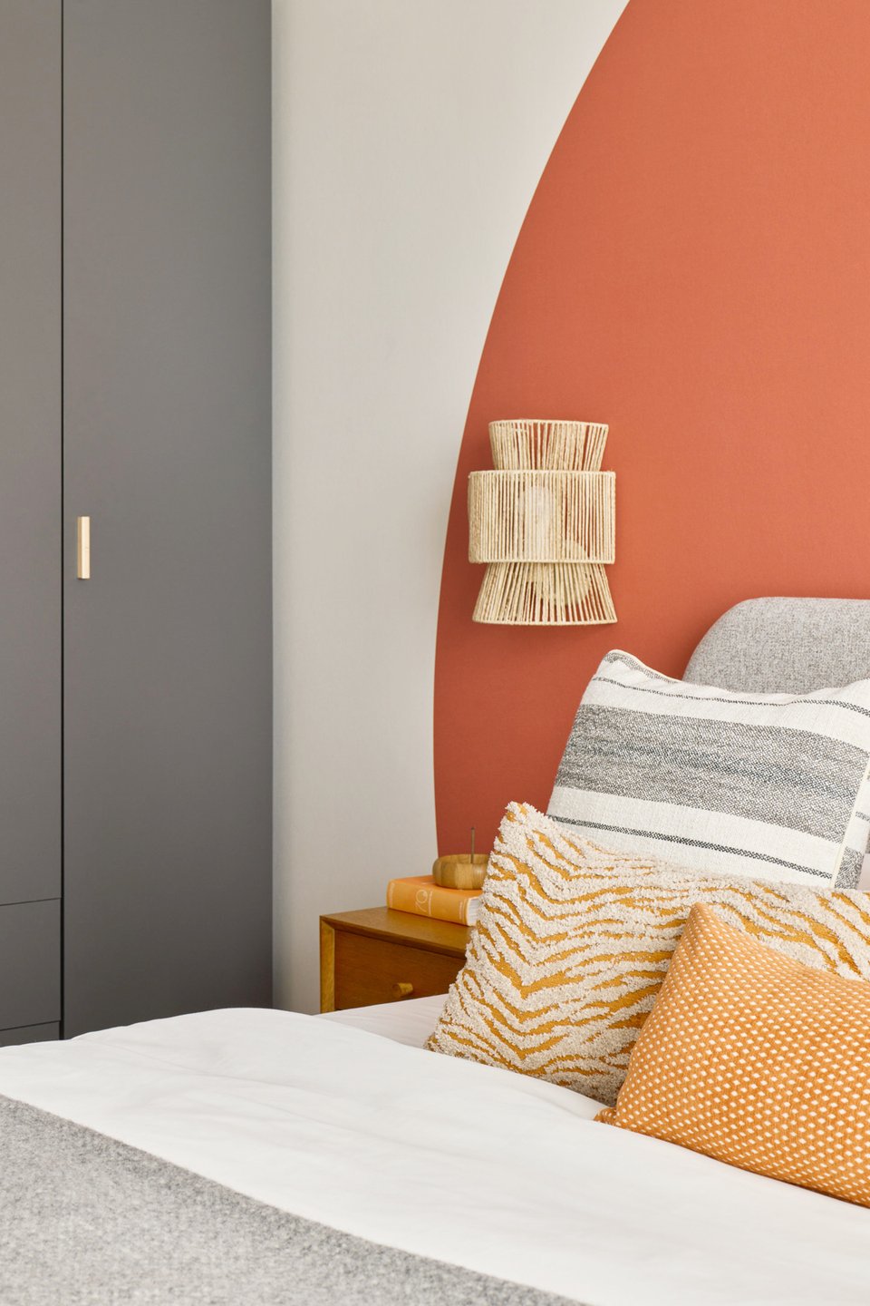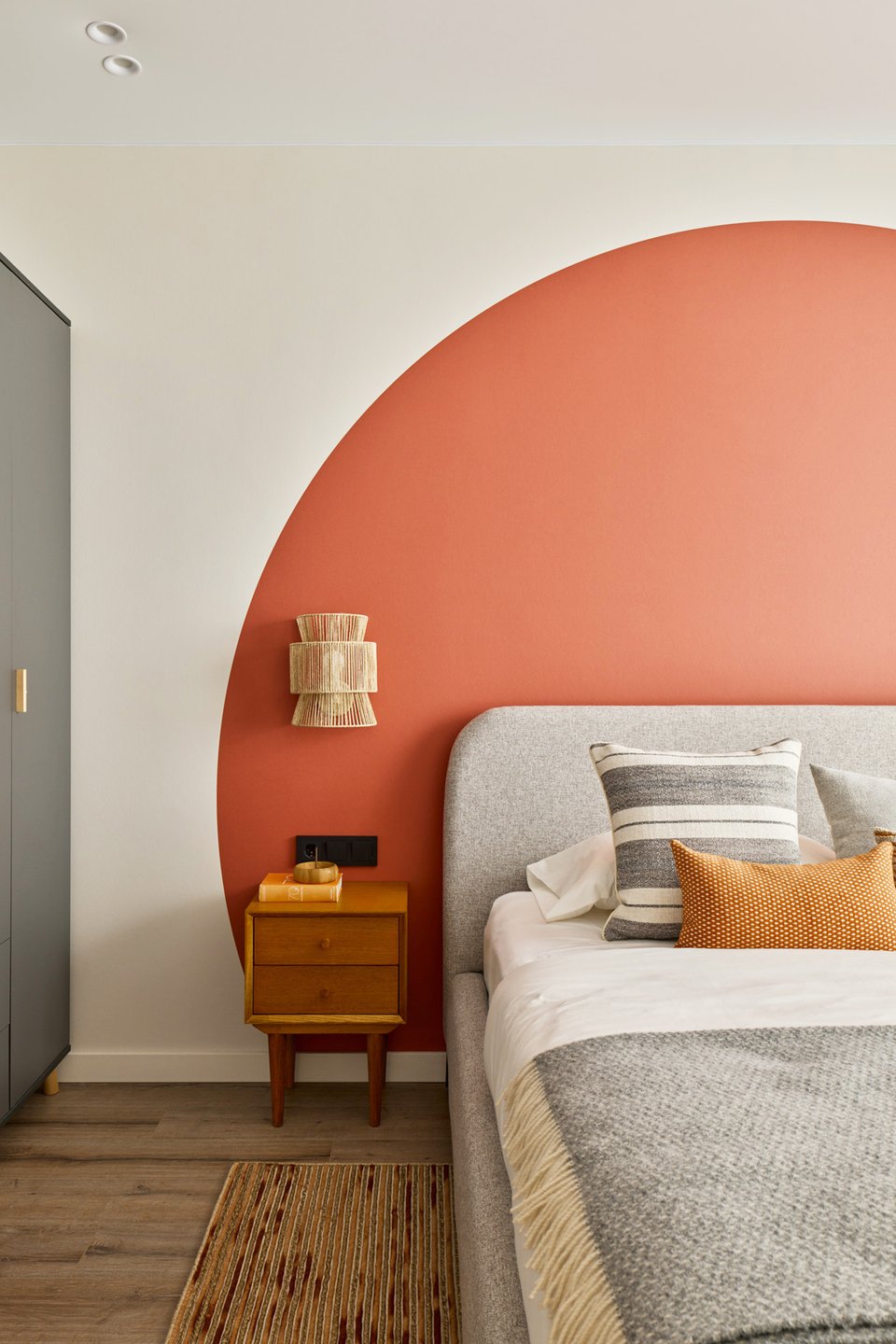 Мебель в спальню выбирали из готовых решений. Чтобы в комнате было больше «воздуха», все позиции здесь на ножках. Акцентный круг (как символ бесконечности) за изголовьем выполнен в том же терракотовом цвете, что и акценты в кухне-гостиной.