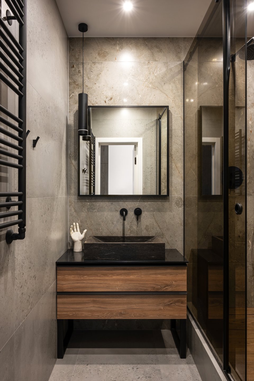 В раздельном санузле базой для отделки стал керамогранит под дерево — он перекликается по тону с древесными элементами в гостиной, создавая ощущение единого стилевого решения. В паре с ним использован керамогранит под бетон и тесаный камень — эти материалы добавляют пространствам легкой брутальности и подчеркивают мужской характер интерьера.
