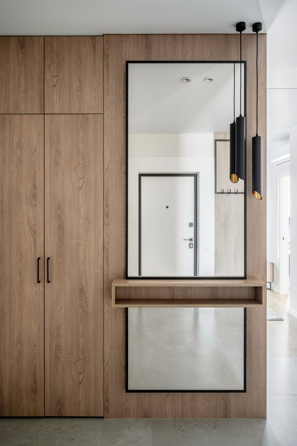 Часть стен во входной зоне оформили мебельными панелями с отделкой под дерево. Они замаскировали нишу, внутри которой находится постирочная. Со стороны гостиной нишу обыграли встроенным шкафом для посуды со стеклянными фасадами.