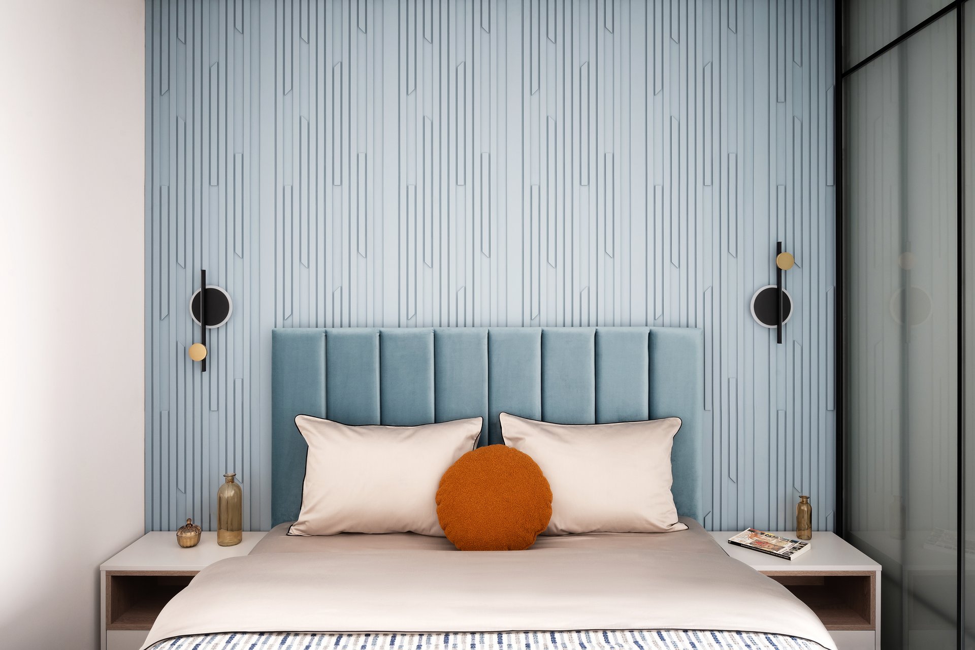 В спальне акцентной стала стена за изголовьем — ее оформили 3D-панелями, окрашенными в голубой оттенок. Кровать Вега-Floor от divan.ru была выбрана в поддержку линий 3D-панелей, которые визуально задают высоту пространству. Текстильные элементы — покрывало, подушки, шторы — поддерживают цветовую палитру спальни.