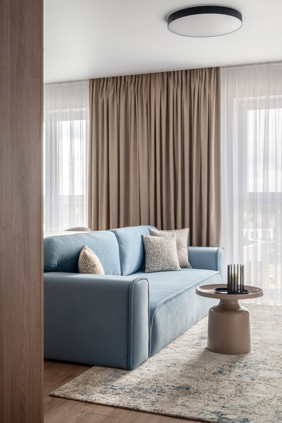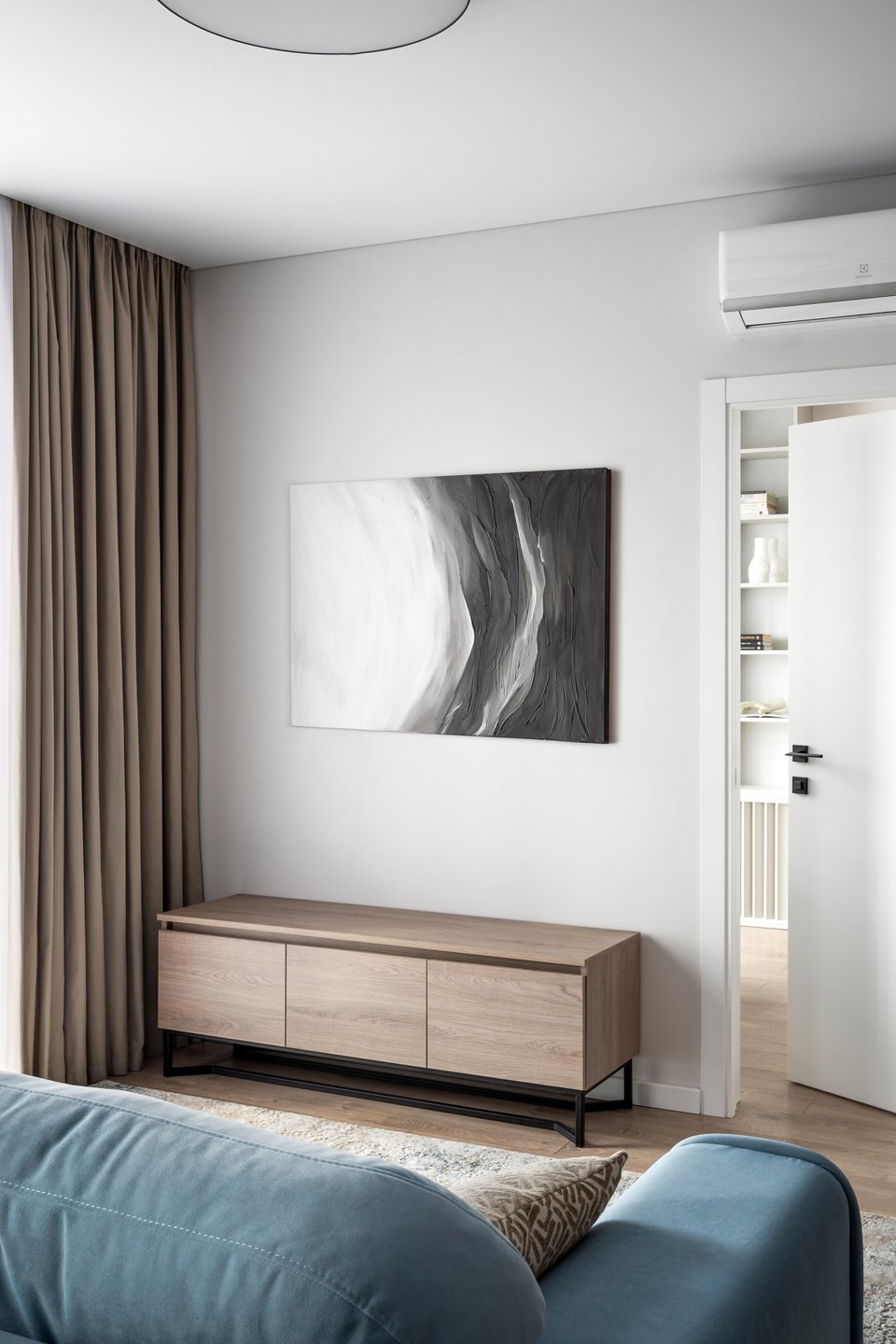 «Материалы подбирались практичные и доступные, но с акцентом на эстетике — важно было, чтобы квартира выглядела современно и стильно, — комментирует дизайнер. — В процессе работы стало понятно, что заказчику близки оттенки синего — они и стали ключевым акцентом, а светлая палитра общего фона делает обстановку легкой и воздушной. Так родился интерьер, в котором сочетаются функциональность и индивидуальность — пространство, где комфортно жить сегодня и которое будет актуально и через годы».