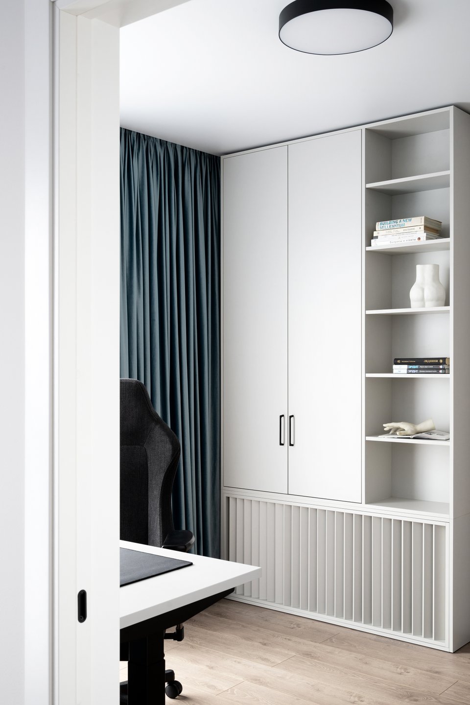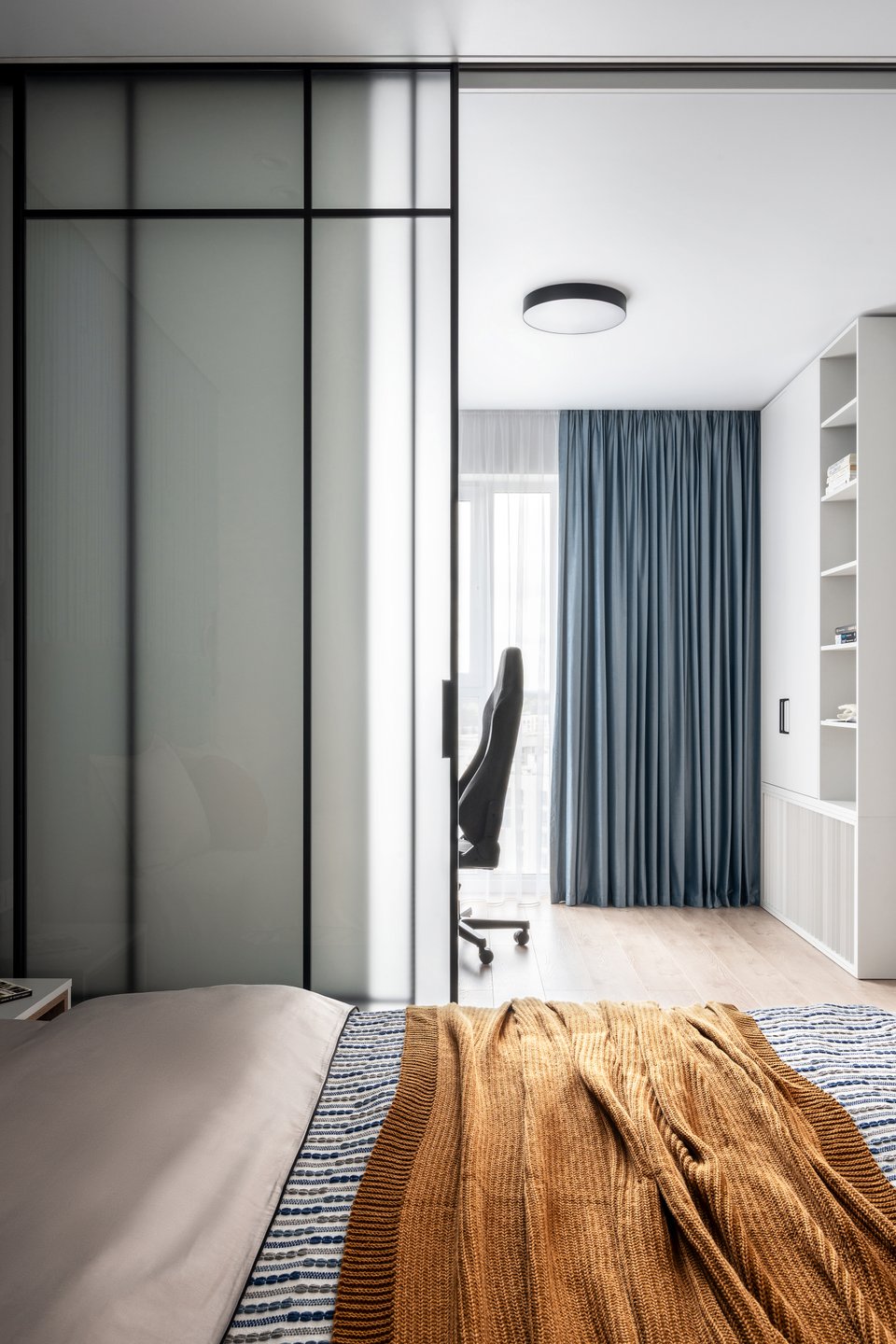 Зона кабинета отделена от спальни раздвижной перегородкой — решение, которое обеспечивает тишину и уединение, но при этом сохраняет ощущение единого пространства.