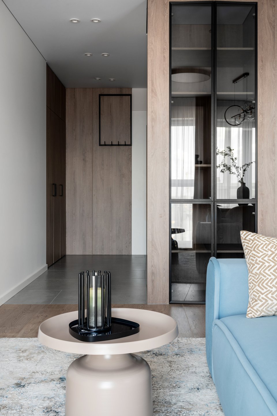 «На первый взгляд колонна могла показаться сложным и неудачным элементом, но именно она стала отправной точкой для планировочного решения. Колонну обыграли и сделали “разделителем” между входной группой и гостиной. При этом визуально ее не видно — колонна интегрирована в функциональный объем. Мы достроили две ниши: со стороны прихожей расположили постирочную зону со стиральной и сушильной машинами, а со стороны гостиной — шкаф с витриной для красивой посуды и элементов декора», — рассказывает автор проекта.