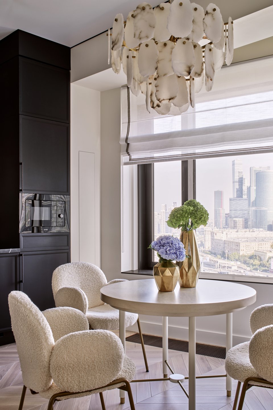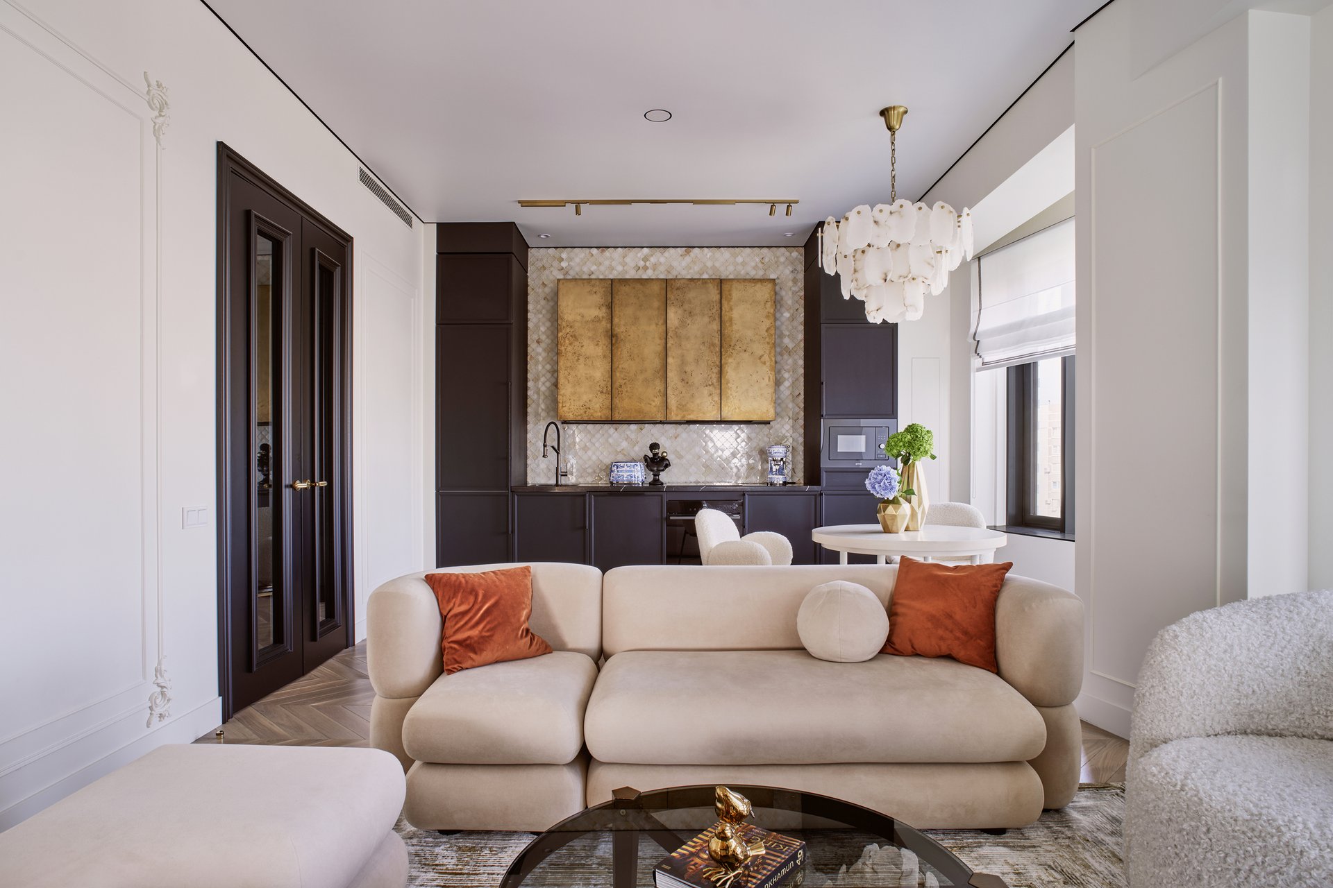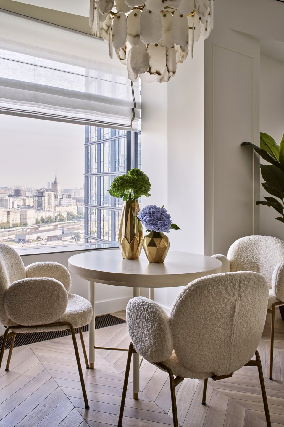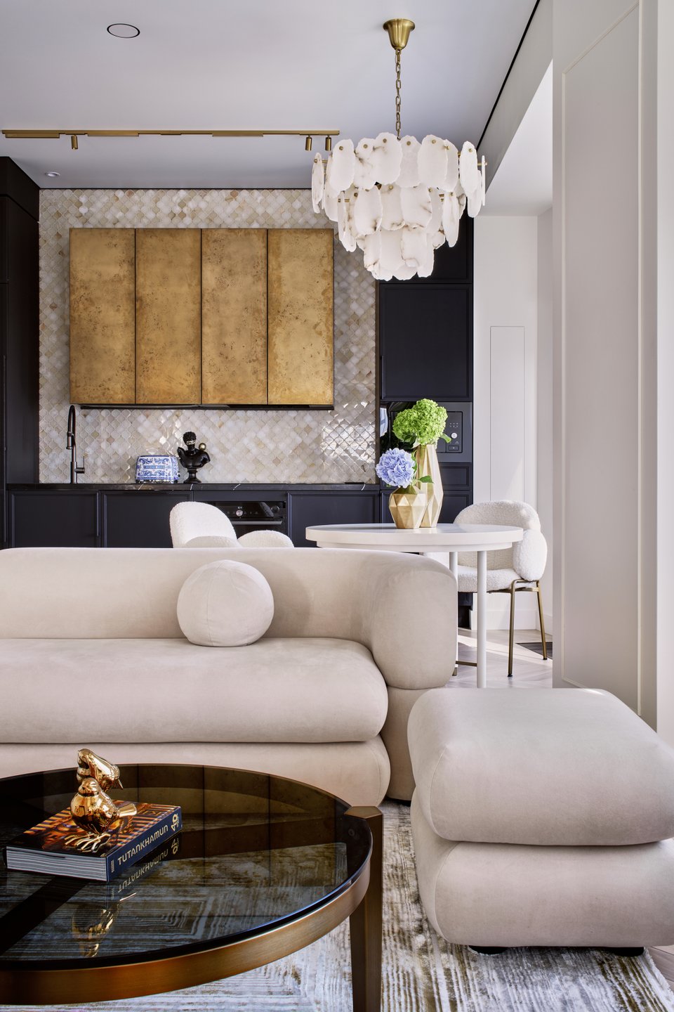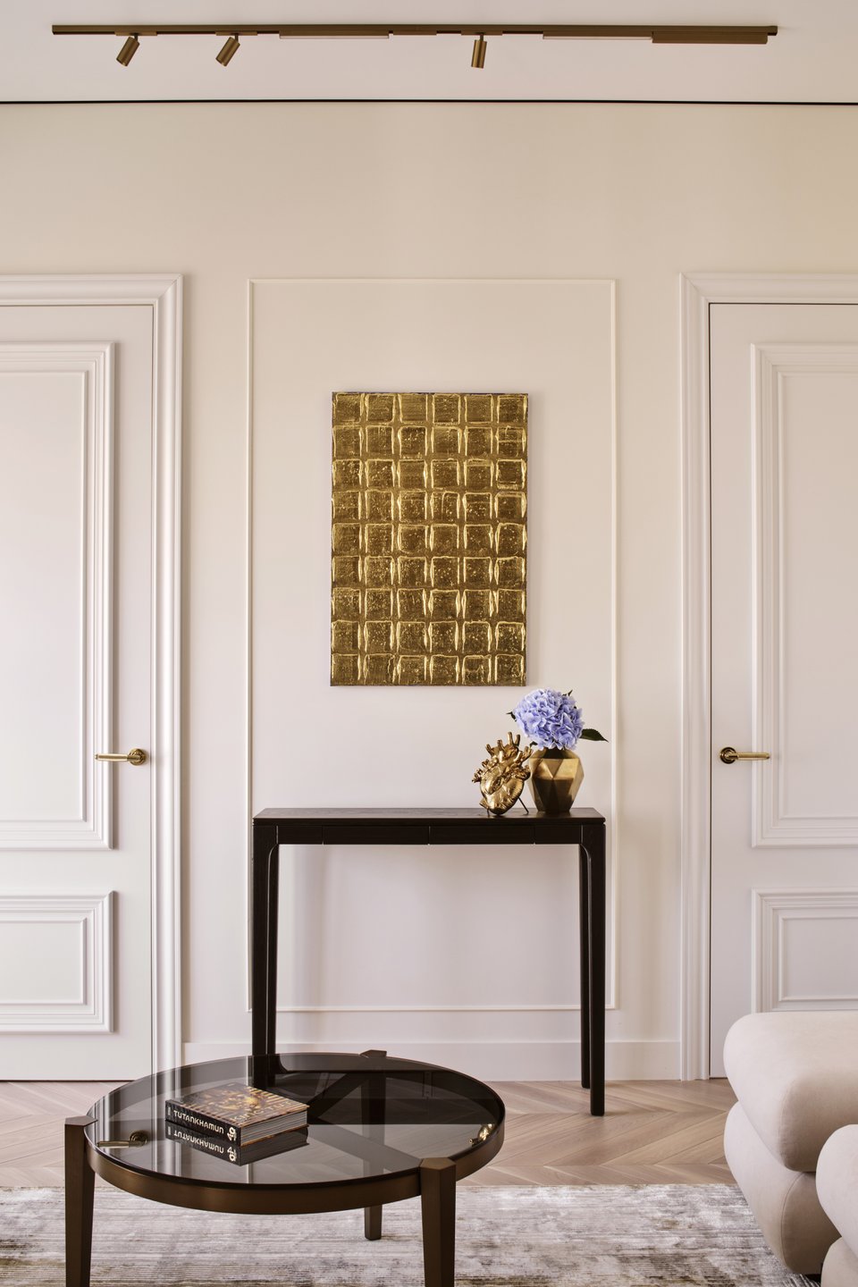 Входную зону выделили напольным покрытием с принтом — это натуральная мозаика из мрамора в виде лепестков. От гардеробной при входе отказались в пользу глубокого шкафа с золотой фурнитурой, так как решили установить двустворчатые двери в гостиную. «С одной стороны, они разделяют пространство, а с другой — уже от входа дарят захватывающий вид на “Москву‑Сити”, который просматривается сквозь прозрачные стеклянные створки», — комментирует автор проекта.