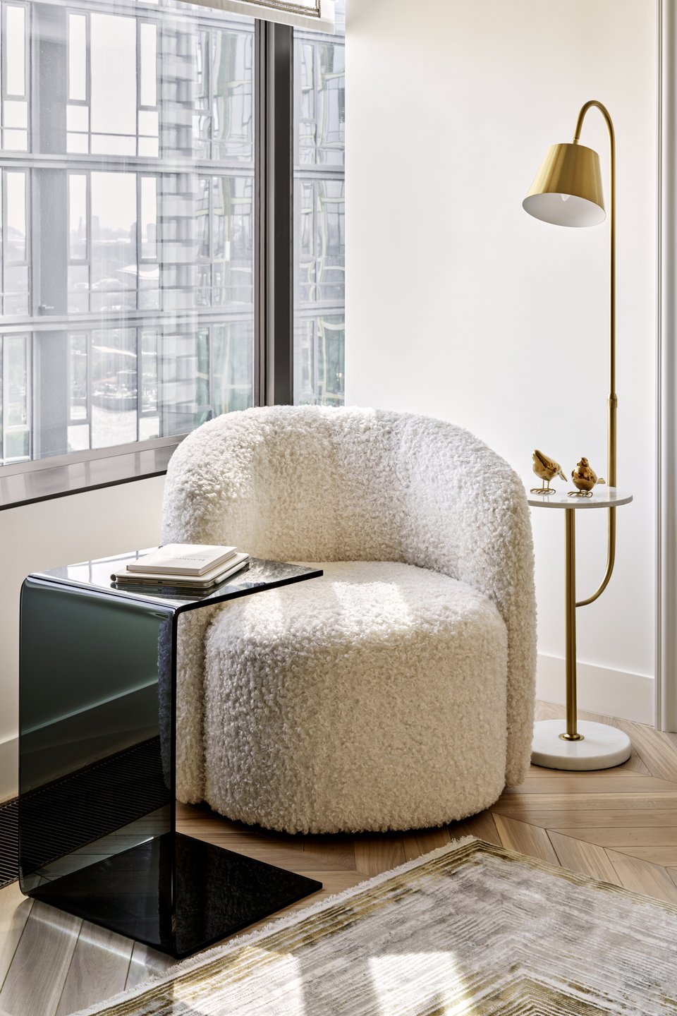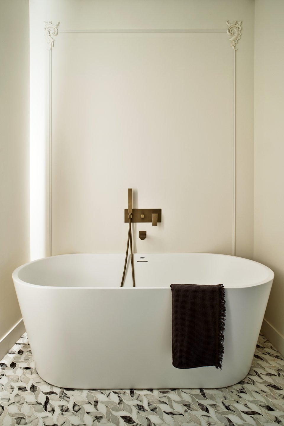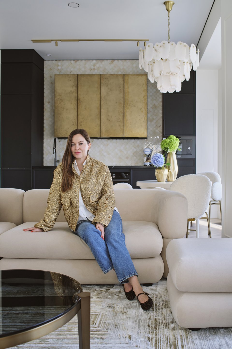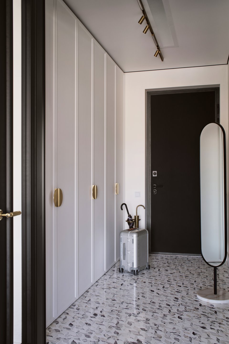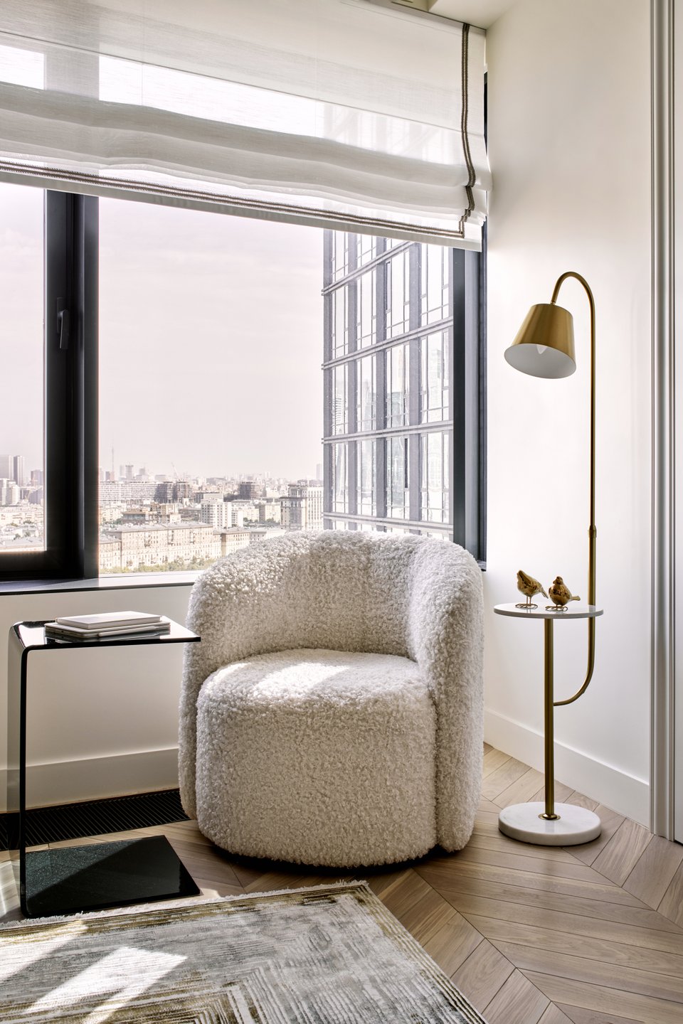 Входную зону выделили напольным покрытием с принтом — это натуральная мозаика из мрамора в виде лепестков. От гардеробной при входе отказались в пользу глубокого шкафа с золотой фурнитурой, так как решили установить двустворчатые двери в гостиную. «С одной стороны, они разделяют пространство, а с другой — уже от входа дарят захватывающий вид на “Москву‑Сити”, который просматривается сквозь прозрачные стеклянные створки», — комментирует автор проекта.