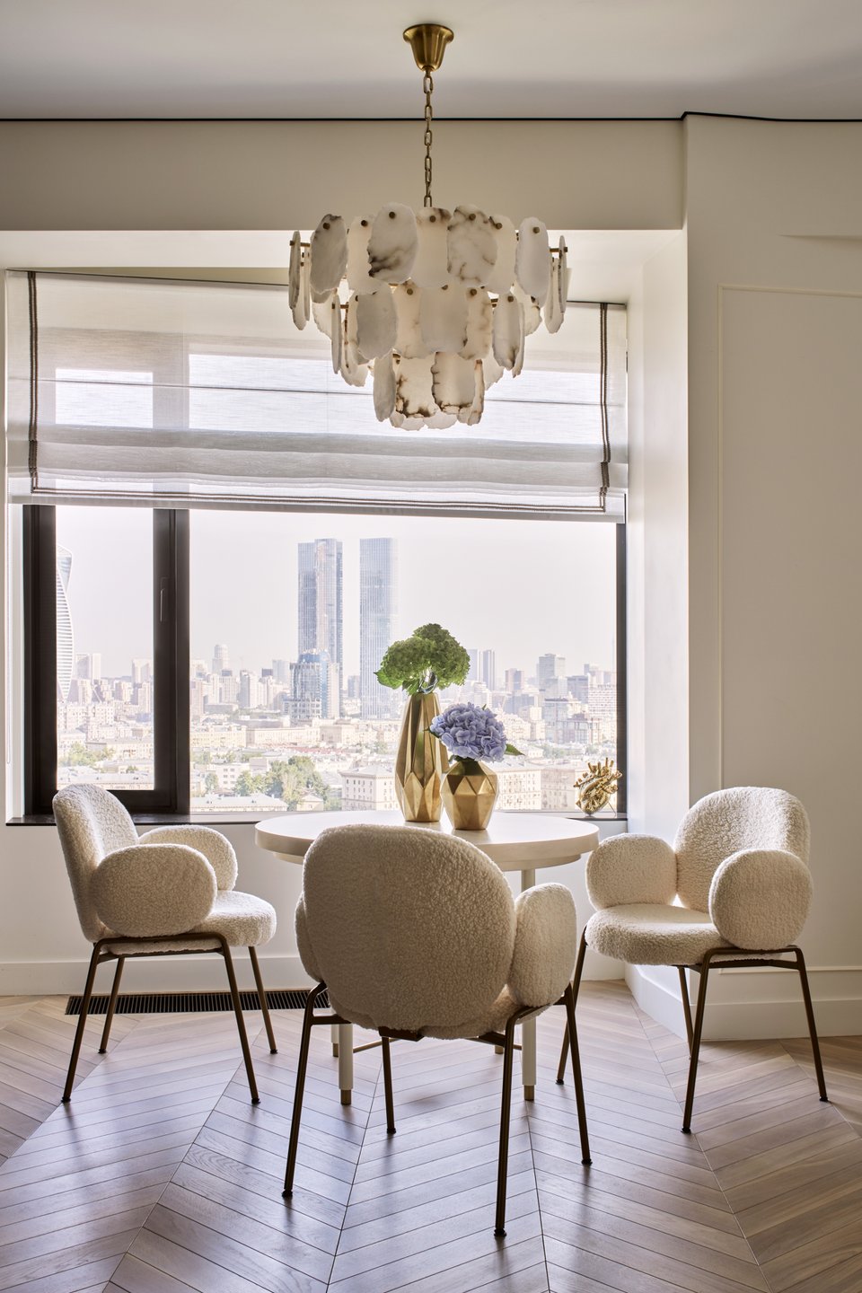 У видового окна расположили обеденную группу с круглым столом, отделанным шпоном «птичий глаз». Акцентная деталь в этой зоне — каменная люстра (это испанский алебастр).