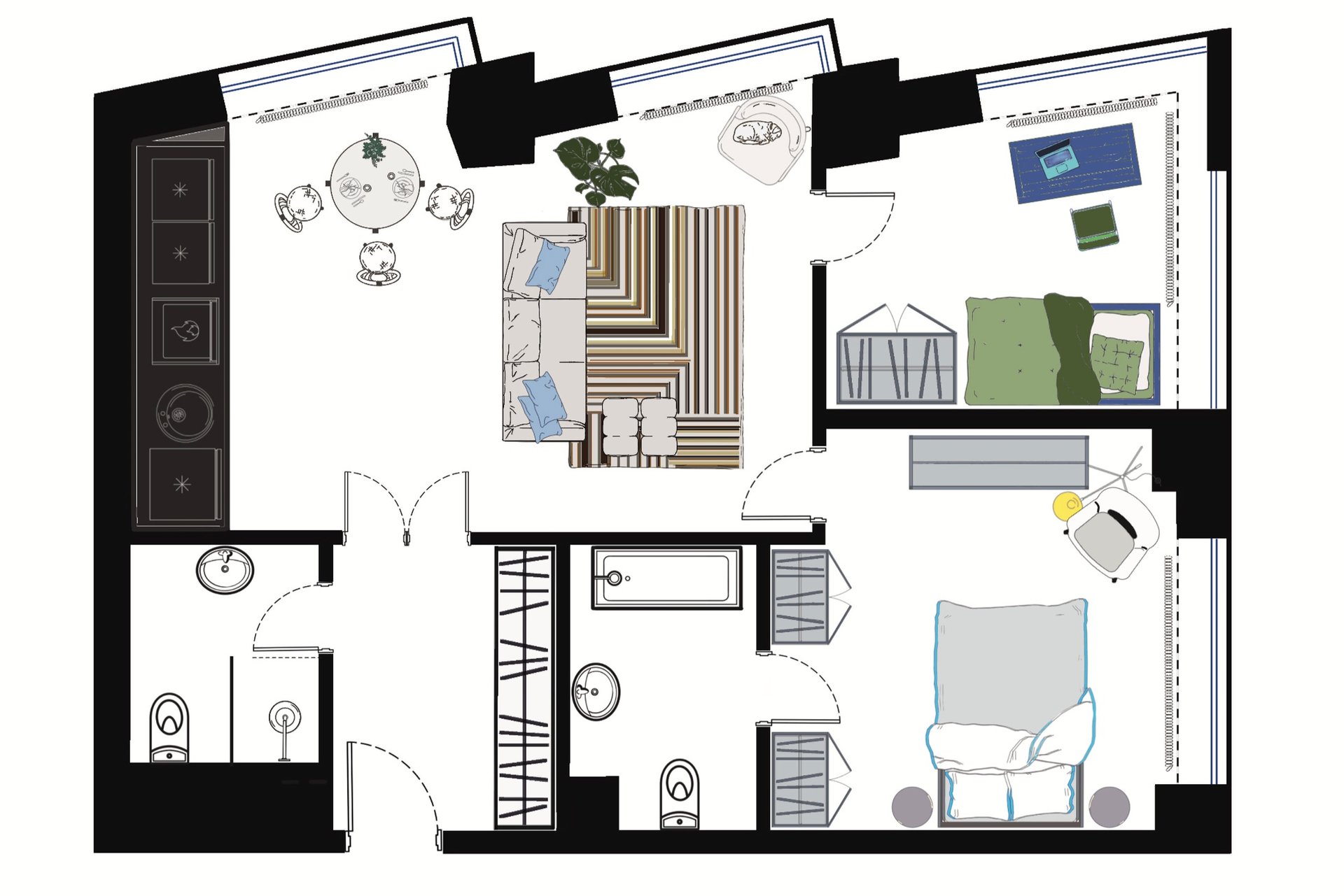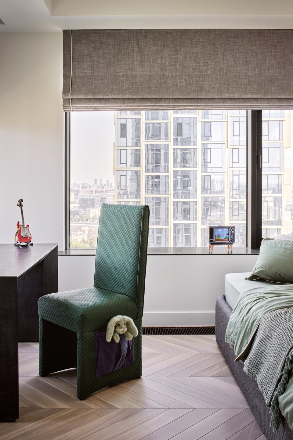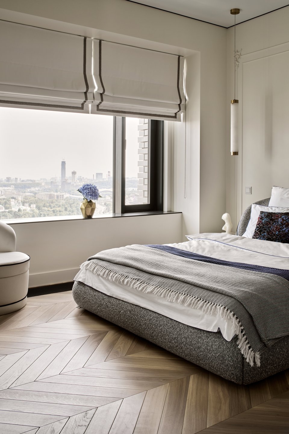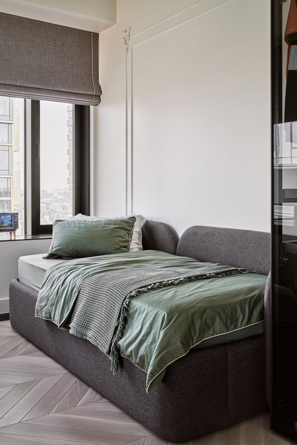 Застройщик сдавал квартиру с предчистовой отделкой. «По одной стене в квартире есть архитектурные элементы фасада — они образуют треугольные ниши с окнами и неудобными выступами, — рассказывает автор проекта. — Пришлось найти решение: частично демонтировать элементы, оставив металлические конструкции за шторами, и добавить внутреннюю подсветку. Это визуально облегчило пространство и создало дополнительный сценарий освещения».