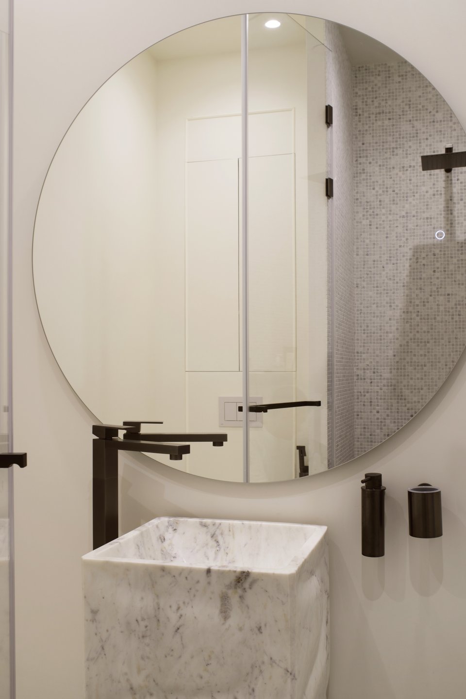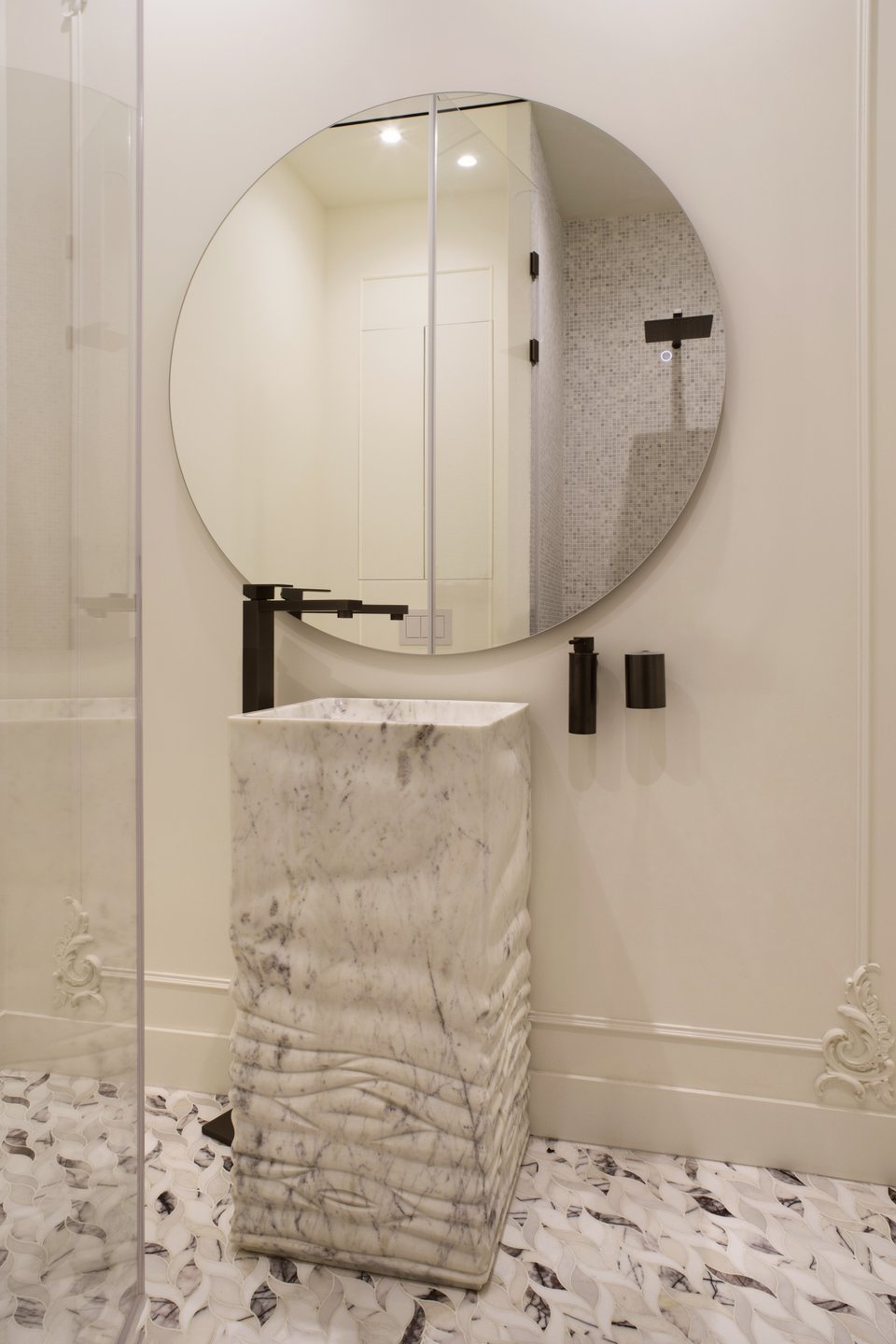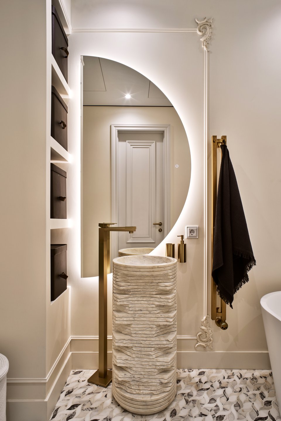 Один из санузлов (с ванной) расположен при спальне, вход во второй (гостевой) находится в прихожей. В обоих установили высокие напольные раковины из камня и акцентные смесители.