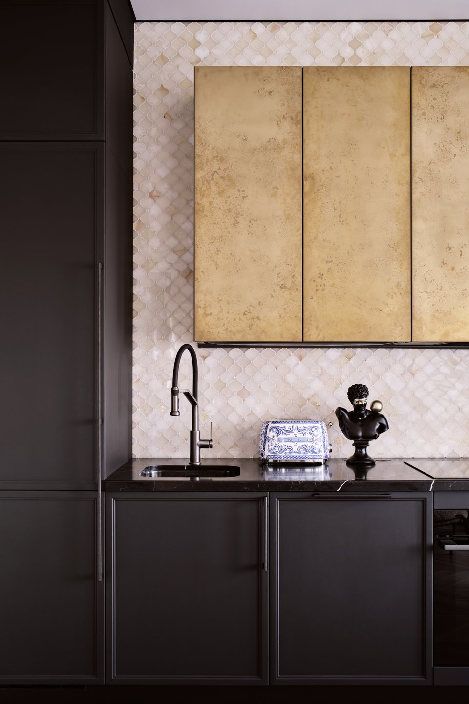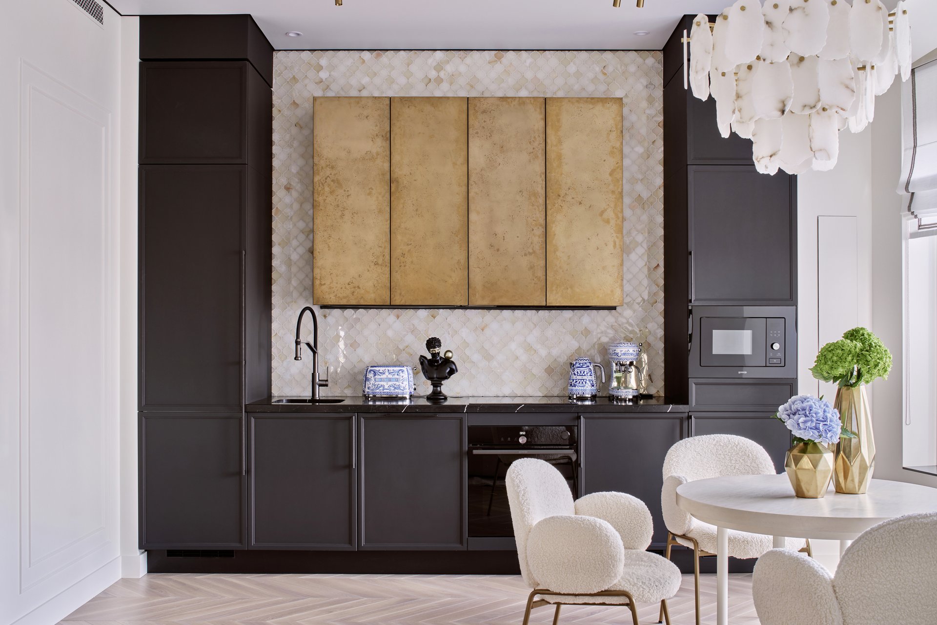 Стены в комнатах покрыли светлой краской и задекорировали молдингами. На полу — инженерная доска в раскладке «французская елочка». Кухонный фартук выложили мозаикой из белого оникса. Особенно эффектно смотрятся на этом фоне верхние шкафы в виде золотого прямоугольника. Их фасады отдельно красили в мастерской.
