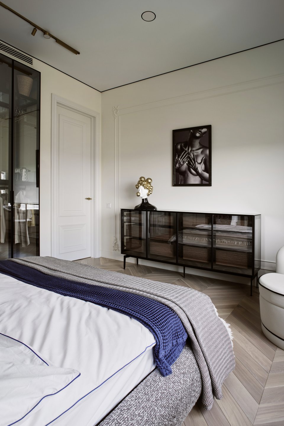 Шкафы и комод выполнены на заказ с учетом габаритов и внутреннего наполнения. Стеклянные фасады шкафов покрыли жемчужным напылением, которое создает легкую дымку и служит зеркалом.