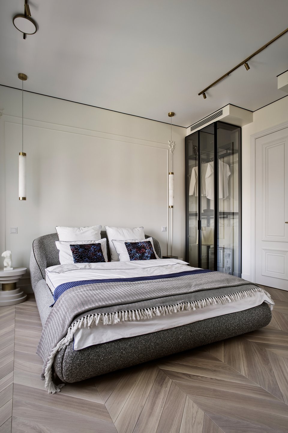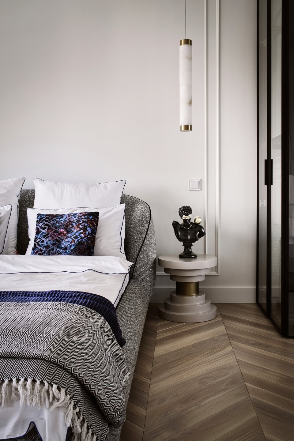 Для отделки спальни использовали те же материалы, что и для кухни-гостиной. Плавные очертания кровати «поддержали» круглыми прикроватными столиками. С обеих сторон от изголовья — подвесные светильники из натурального камня.