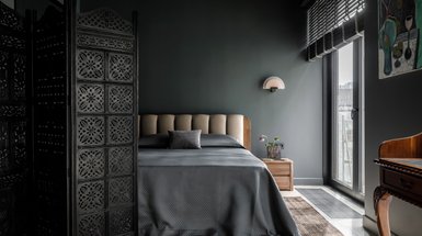 Комнату разделили на три части: зону отдыха с кроватью, рабочее место с письменным столом и вместительную гардеробную за зеркальной дверью. Стену за изголовьем украсили комбинацией из теневых реек, которые строители смонтировали еще на этапе подготовки стен. Рабочее место выделили темным графитовым цветом, его же «пустили» на потолок. Таким образом замаскировали кондиционер — он слился с темной стеной.