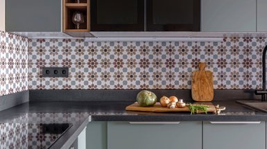 Стеклянная дверь пропускает свет и не создает оторванности от общего пространства. Керамогранит на полу в форме октагонов со вставками оливкового цвета отсылает к классическим английским интерьерам. Тон плитки для фартука подбирали под цвет стен в гостиной, чтобы сохранить единство интерьера. Глянцевая плитка с деликатным винтажным эффектом и неровной поверхностью оттеняет латунную итальянскую сантехнику.