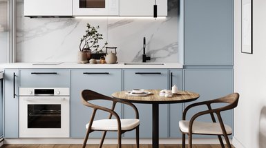 Площадь кухни всего 4,8 кв.м. П-образная форма гарнитура позволила задействовать все полезное пространство. Белые фасады визуально расширяют небольшое помещение. Столешница под мрамор изготовлена из кварца. Классическую тему поддерживает современная техника Smeg.