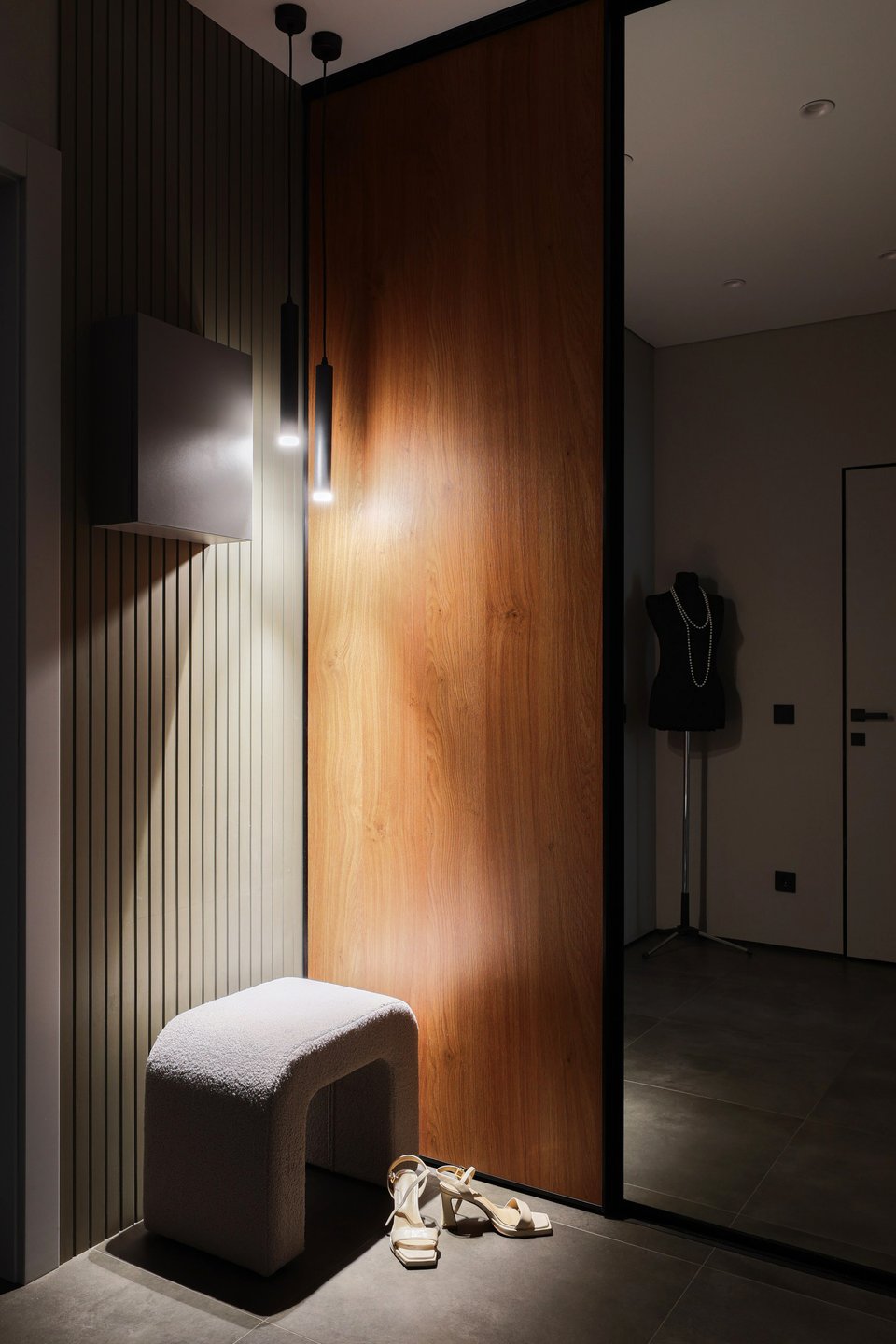 Вешать крючки или ставить напольную вешалку супруги не хотели, но у заказчицы в силу ее профессии был манекен для примерки театральных костюмов. Решили поставить его у входной двери. Иногда манекен служит вешалкой, но его главная роль — быть акцентом, разбавляющим монохромный интерьер и напоминающим о творческой жизни заказчиков.
