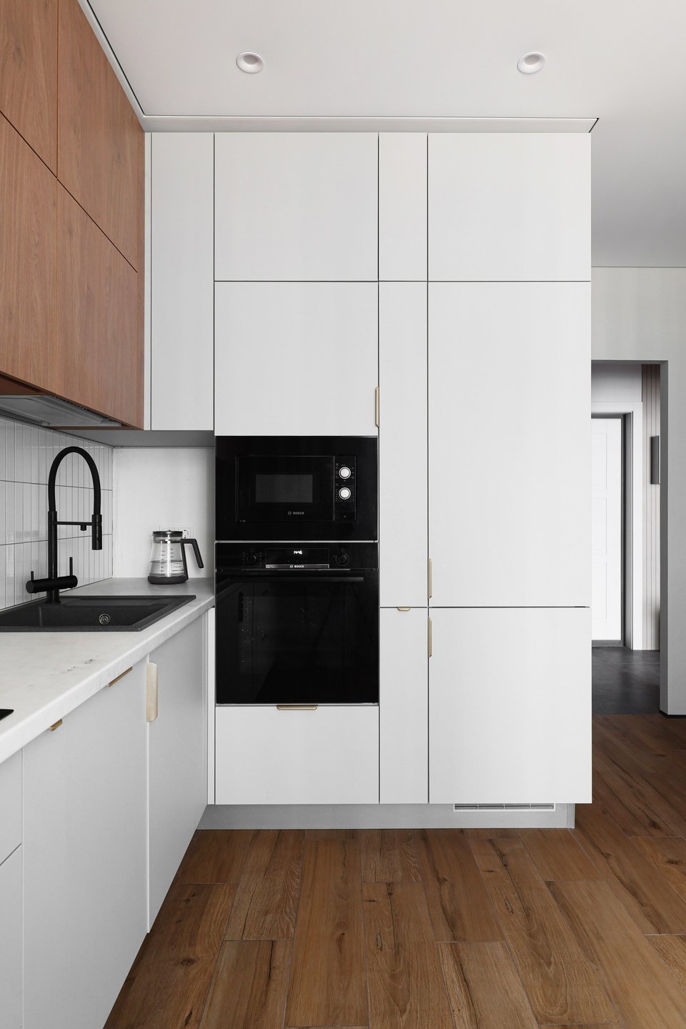 На пол в кухне использовали керамогранит под дерево, так как он устойчив к влаге и долговечен. На кухонном фартуке мелкоформатная глянцевая плитка. Помещение выделено исключительно под кухню и обеденную группу. Две стены занимает угловой гарнитур высотой в потолок. По длинной стене расположена зона для готовки, по короткой — встроенный пенал с техникой и хранением.