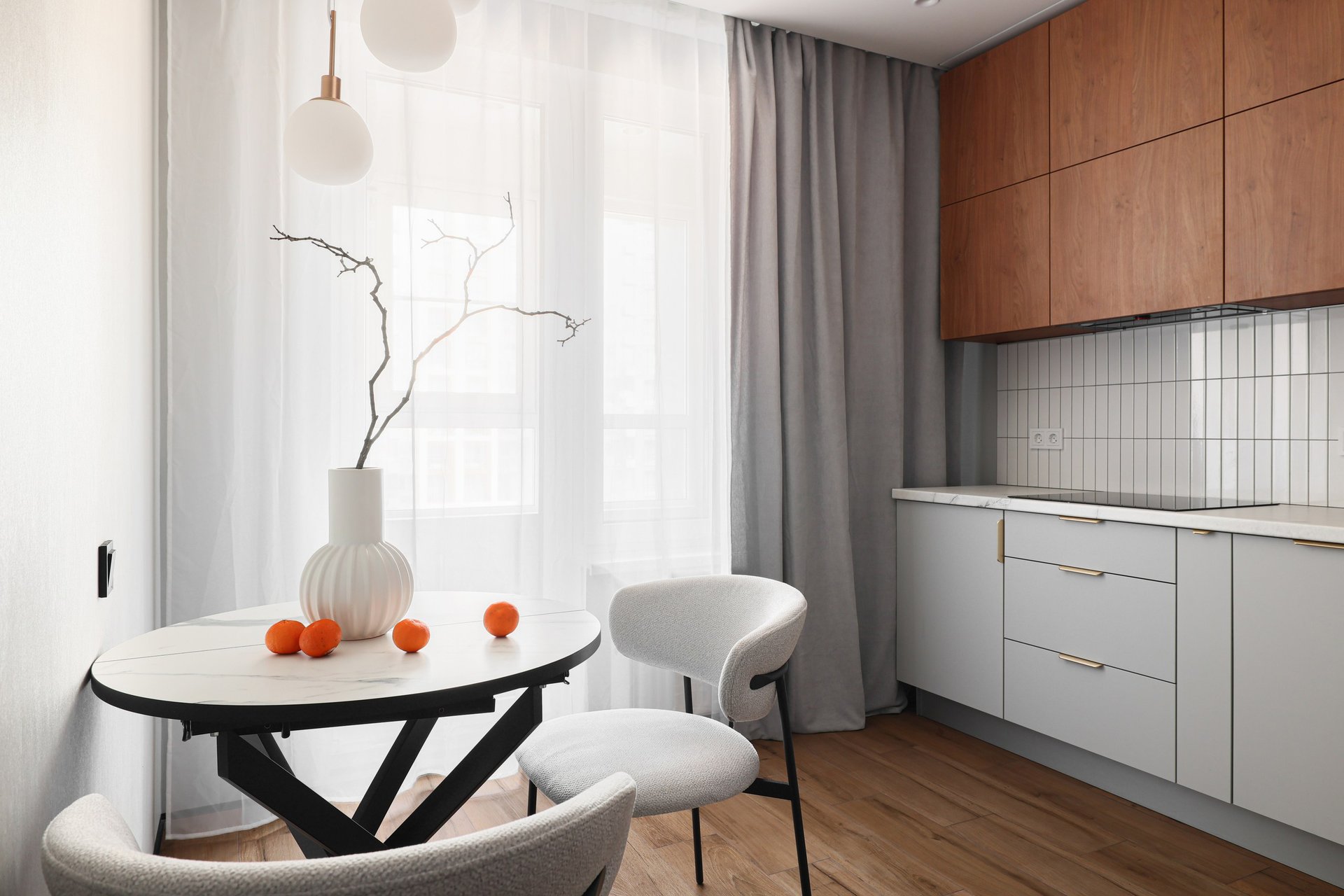 В обеденной зоне установили раскладной стол диаметром 80 см и пару мягких стульев на металлическом основании.