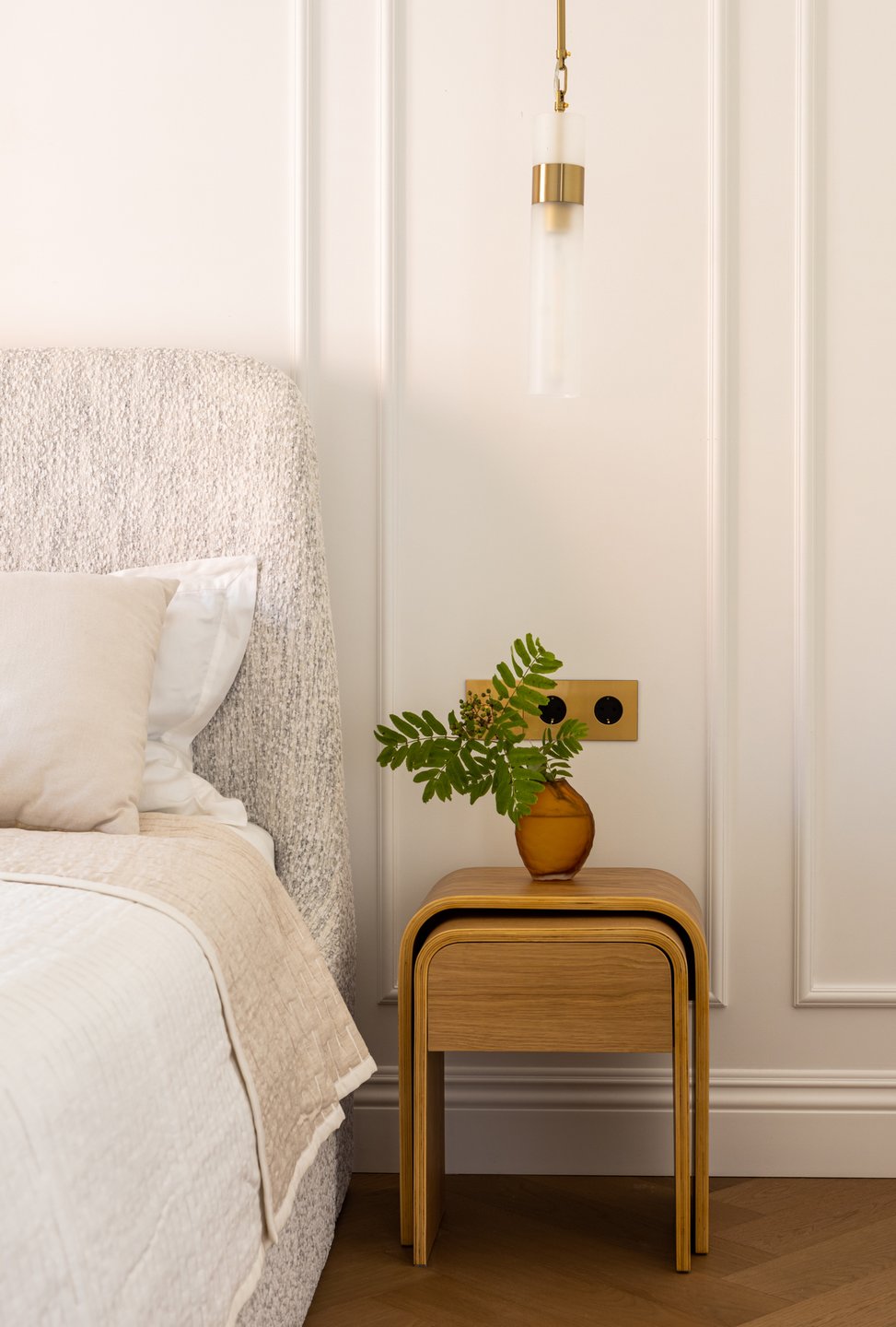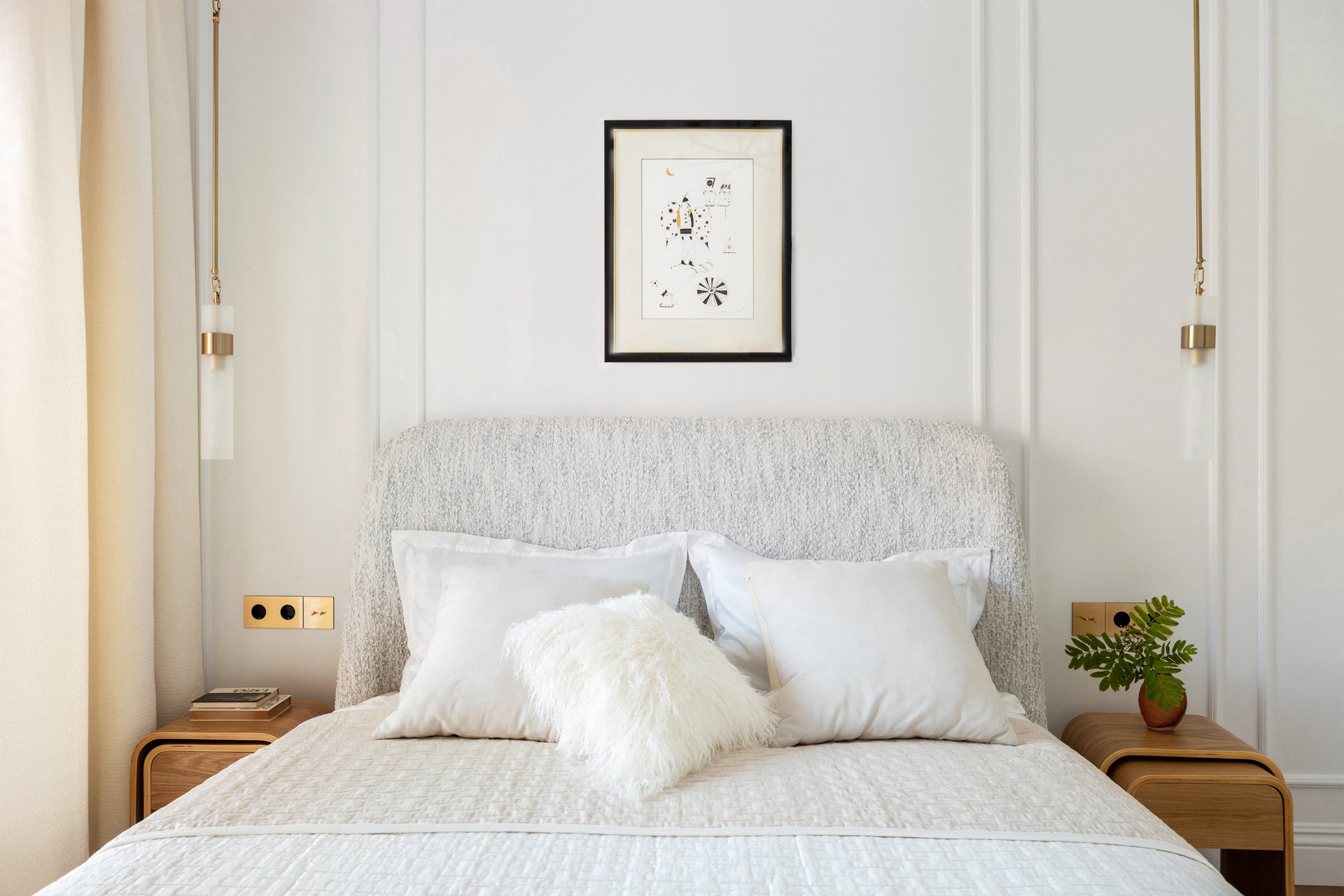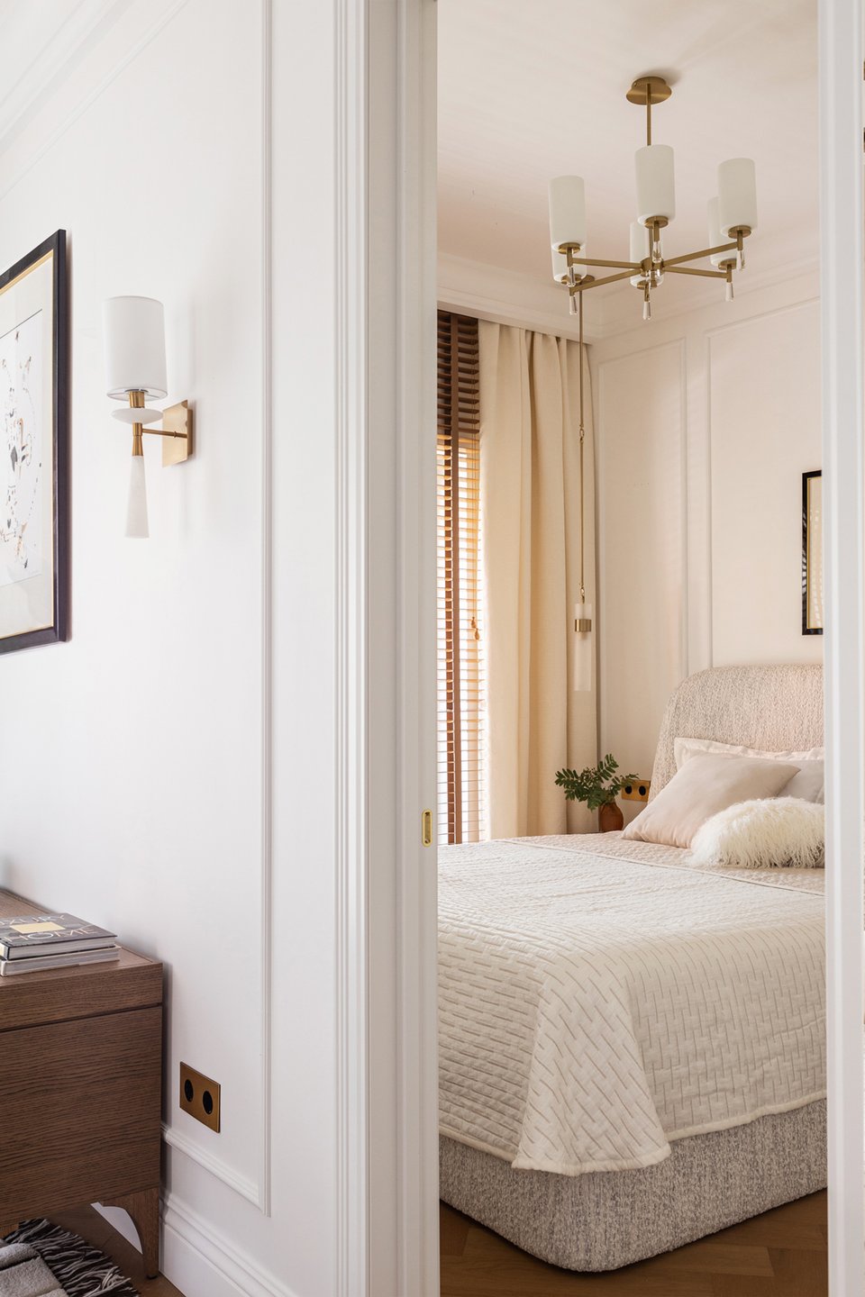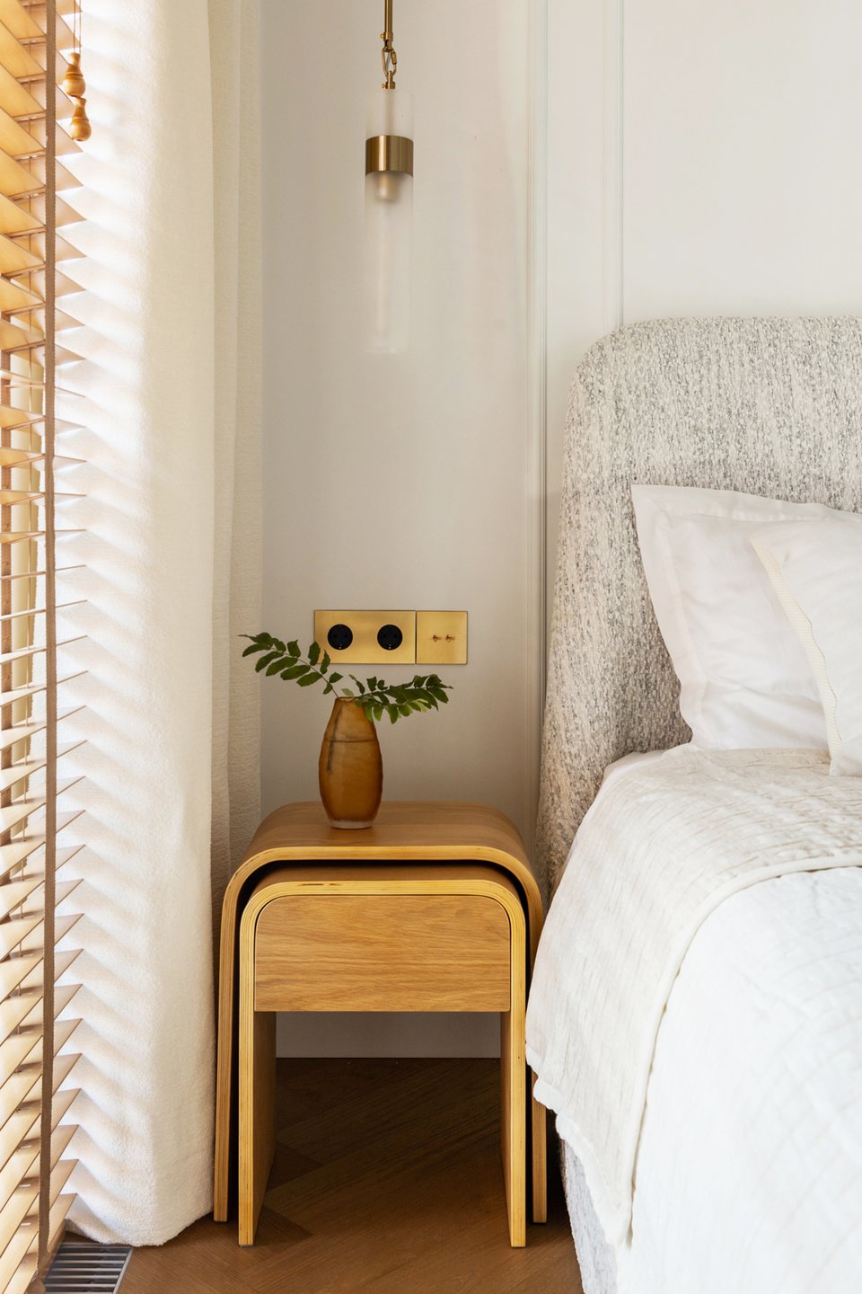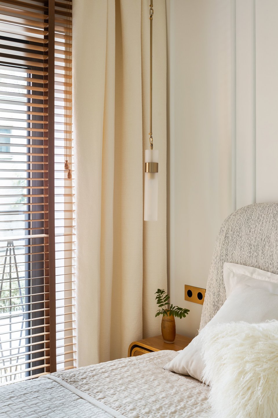 Спальня — настоящий оазис спокойствия. Кровать Молсон с высоким изголовьем в тактильно приятной белой ткани букле заказали в divan.ru. Обстановку дополнили легкими светлыми портьерами и нарядными подвесными светильниками. Традиционные шторы заменили деревянными жалюзи.