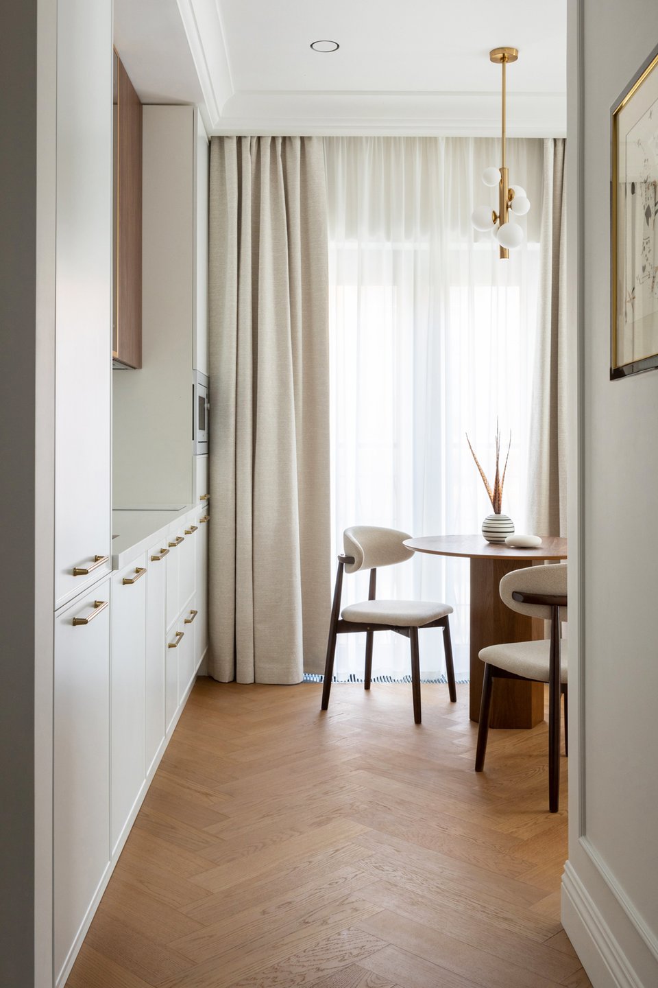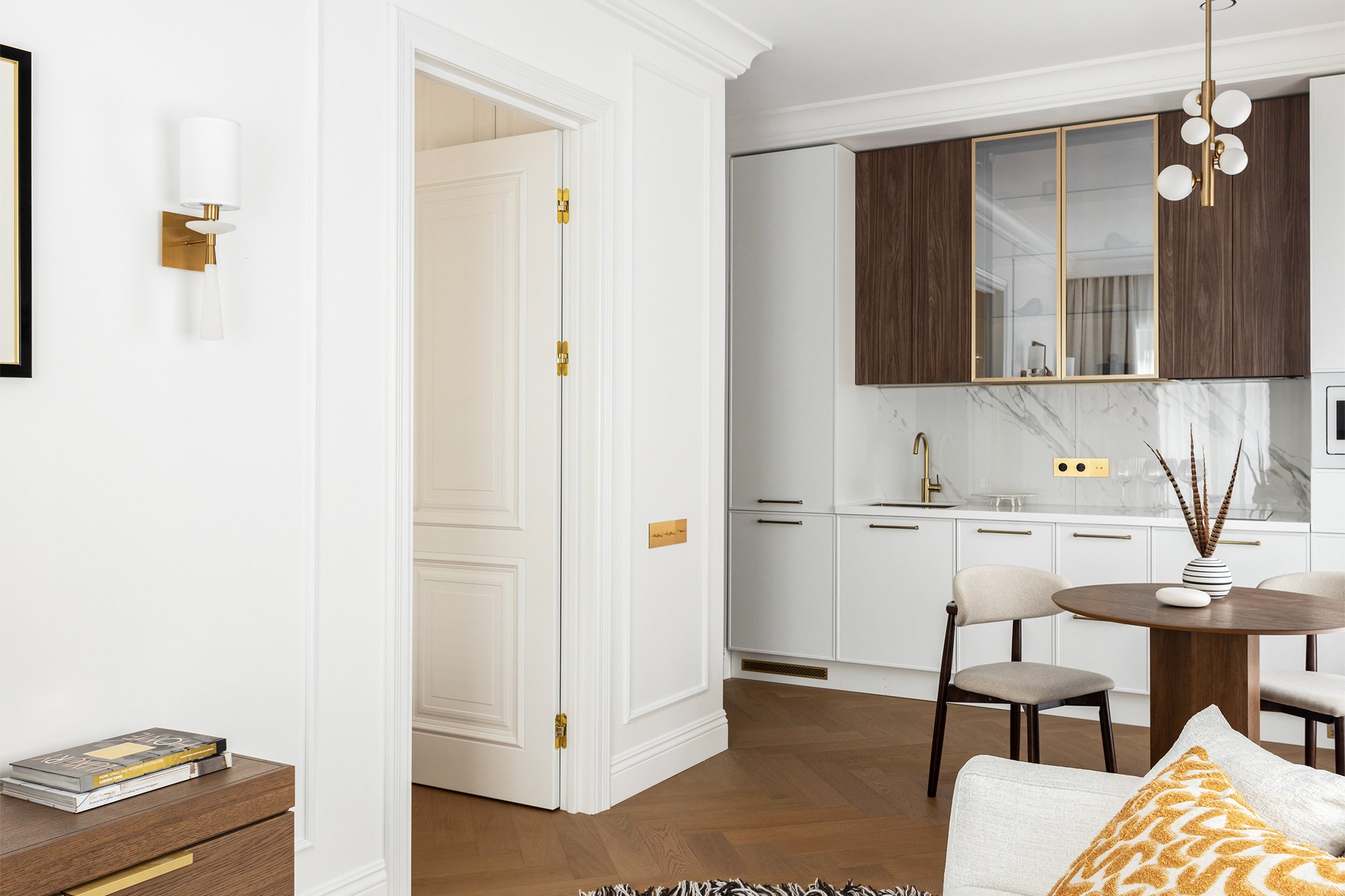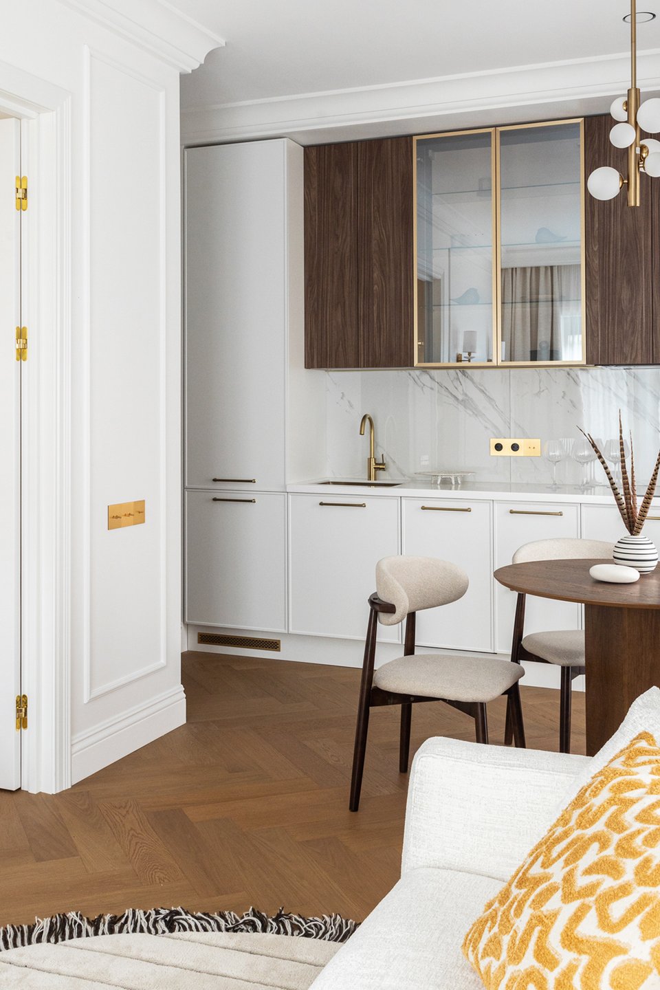 Лаконичный белый кухонный гарнитур изготовили на заказ. За одним из фасадов спрятали стиральную машину с функцией сушки, а в шкафу-пенале предусмотрели ящик для моющих средств. Верхние шкафы под дерево с зеркальными дверцами в золотом обрамлении «связывают» зону готовки с окружающей обстановкой. Компактную обеденную зону дополнительно выделили подвесным светильником.