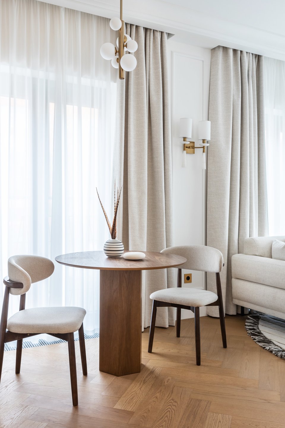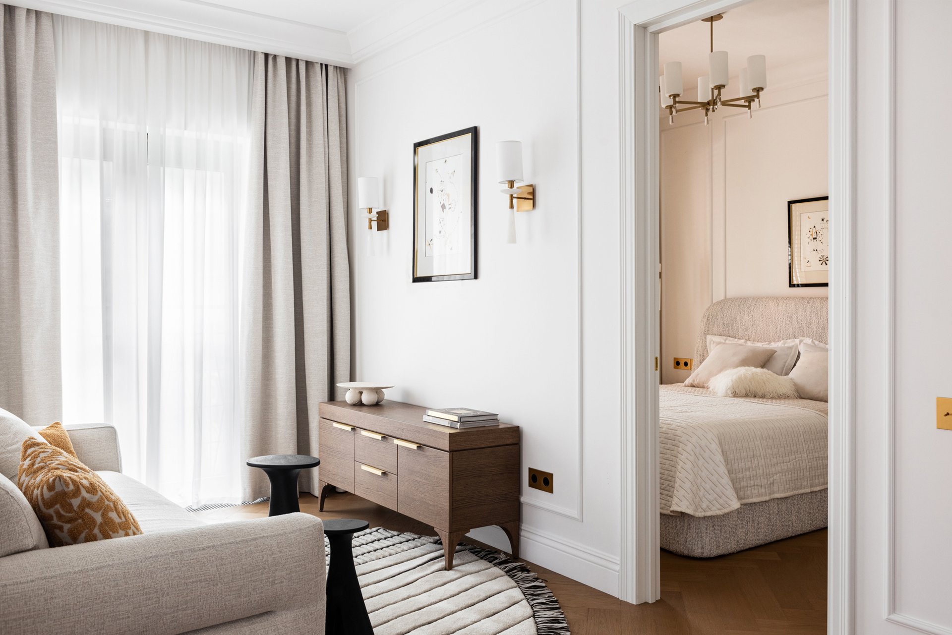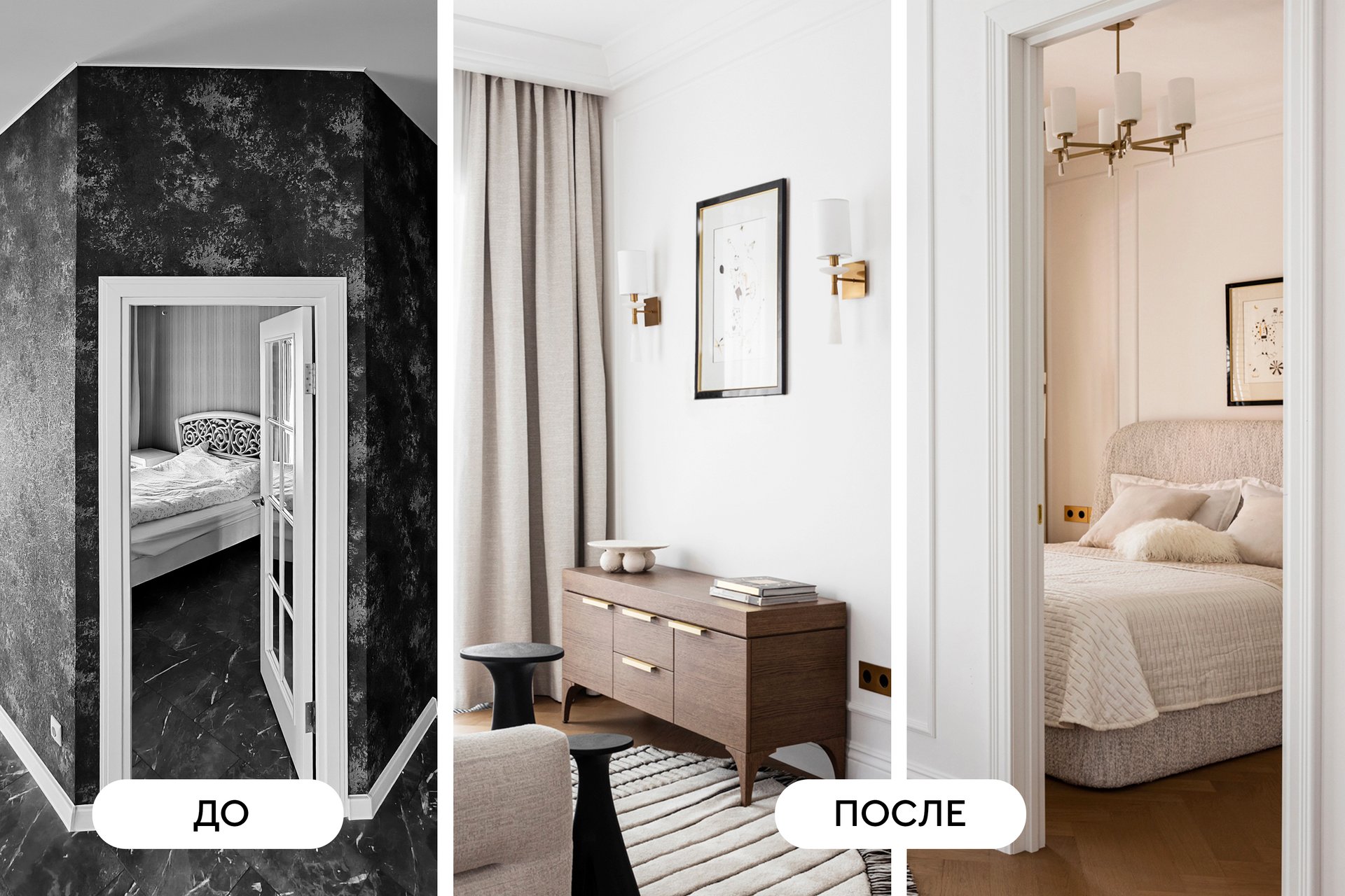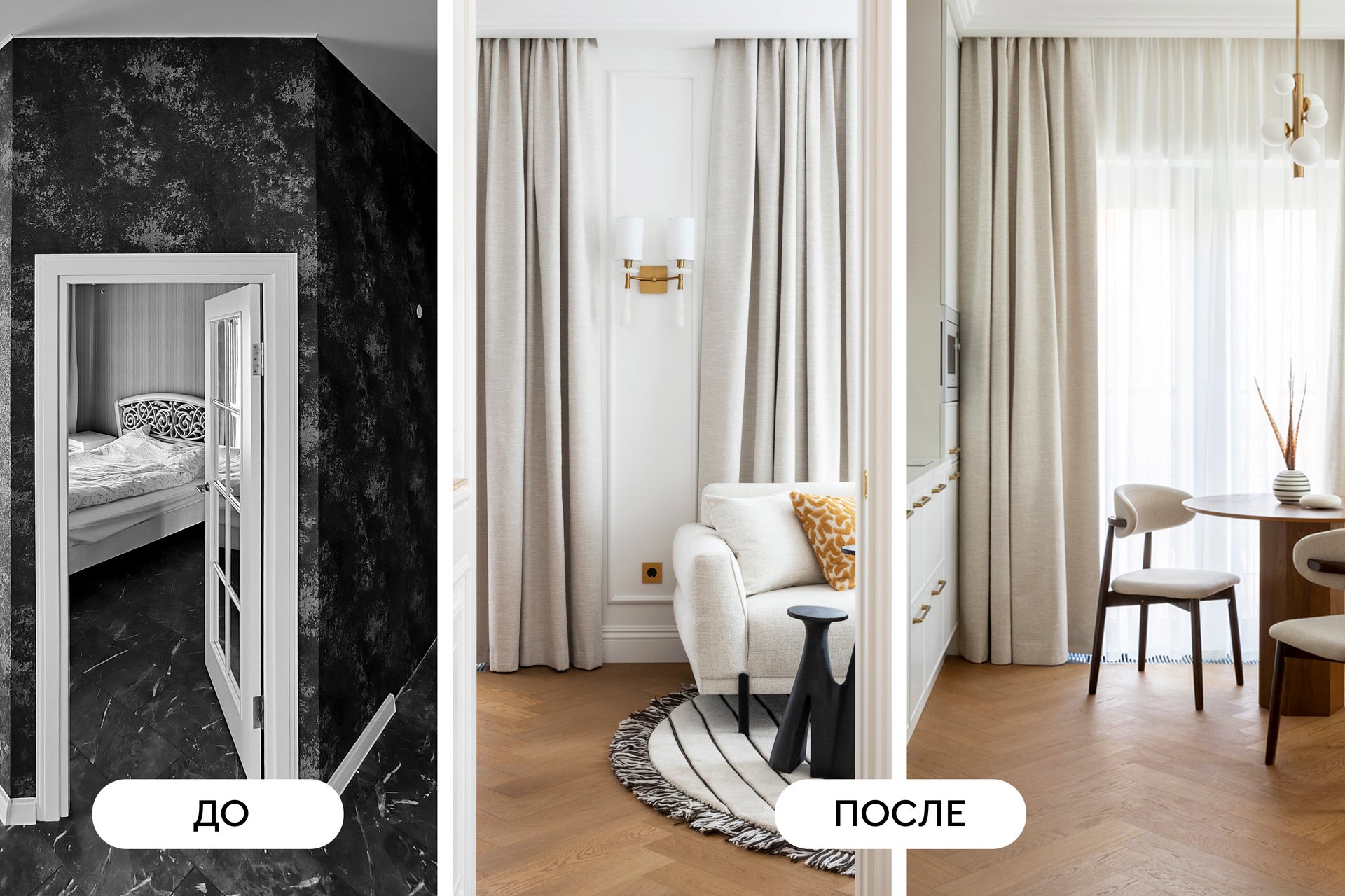 Этот проект показывает, что даже на скромной площади можно создать стильное и многофункциональное пространство. Доминирующий и благородный белый цвет создает ощущение чистоты и легкости, а натуральное дерево и струящийся текстиль добавляют тепла.