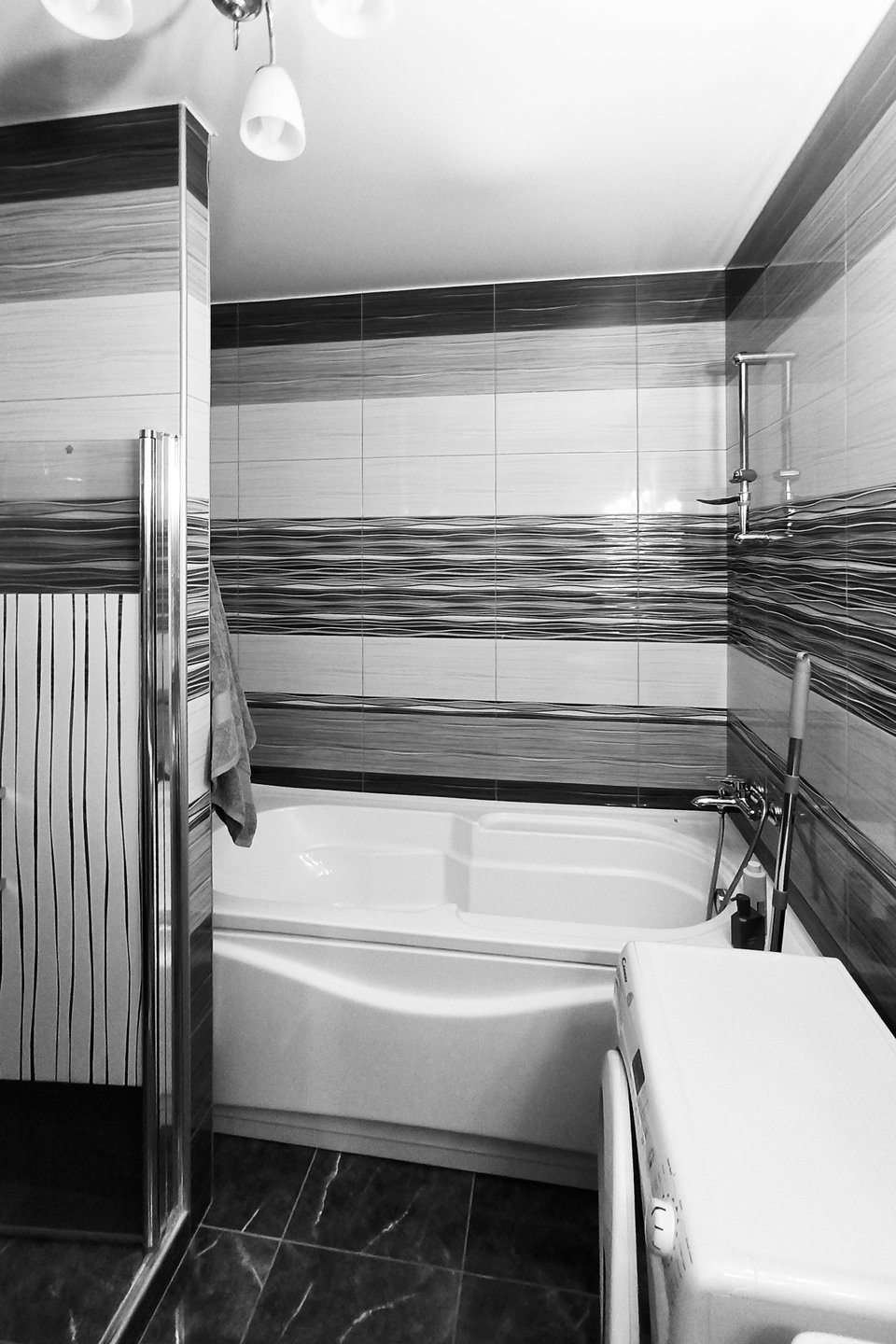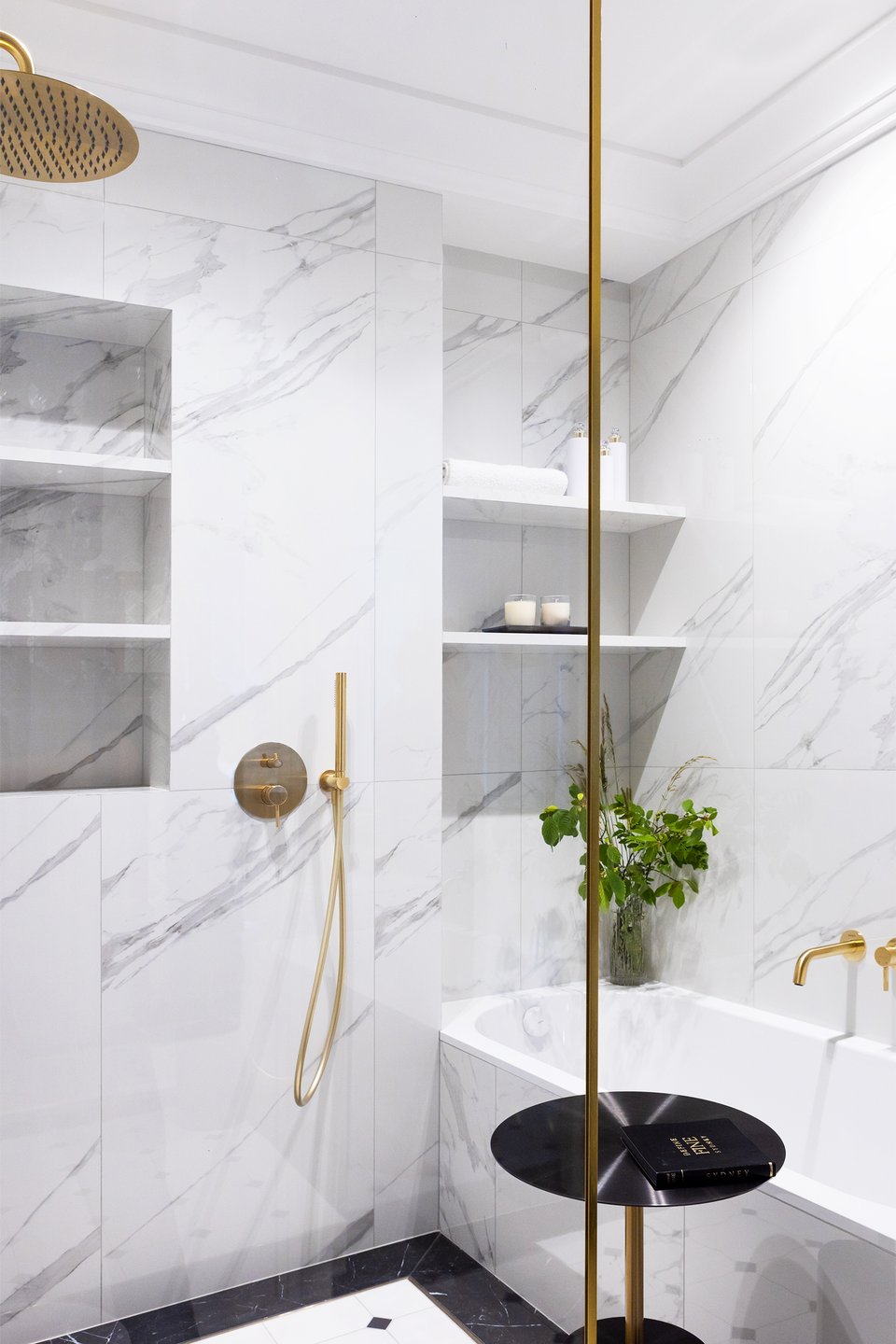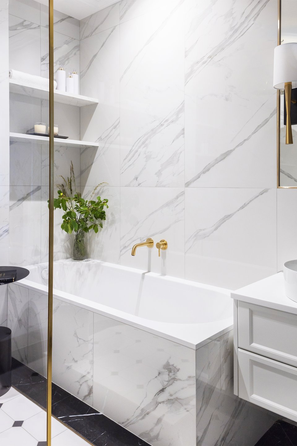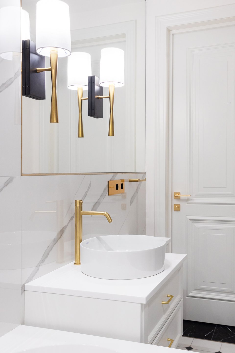 Интерьер санузла продолжает общую концепцию. Стены и ванну облицевали глянцевым белым керамогранитом под мрамор, на полу — та же плитка, что и в прихожей. Латунные смесители и электрика, матовое золото в светильниках и фурнитуре мебели, отдельная душевая зона — здесь царит атмосфера элегантной роскоши.