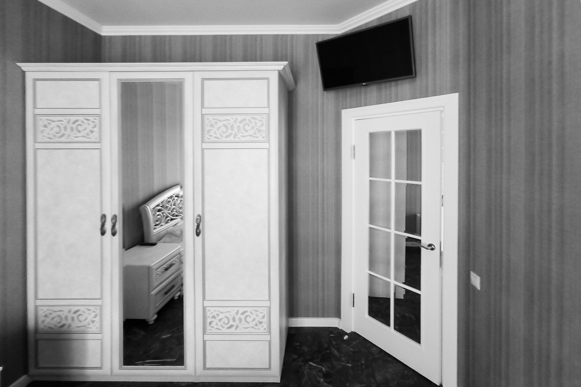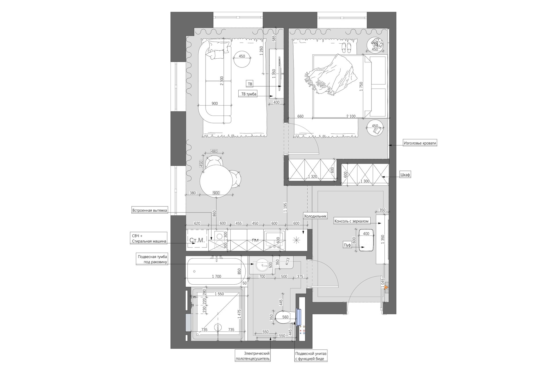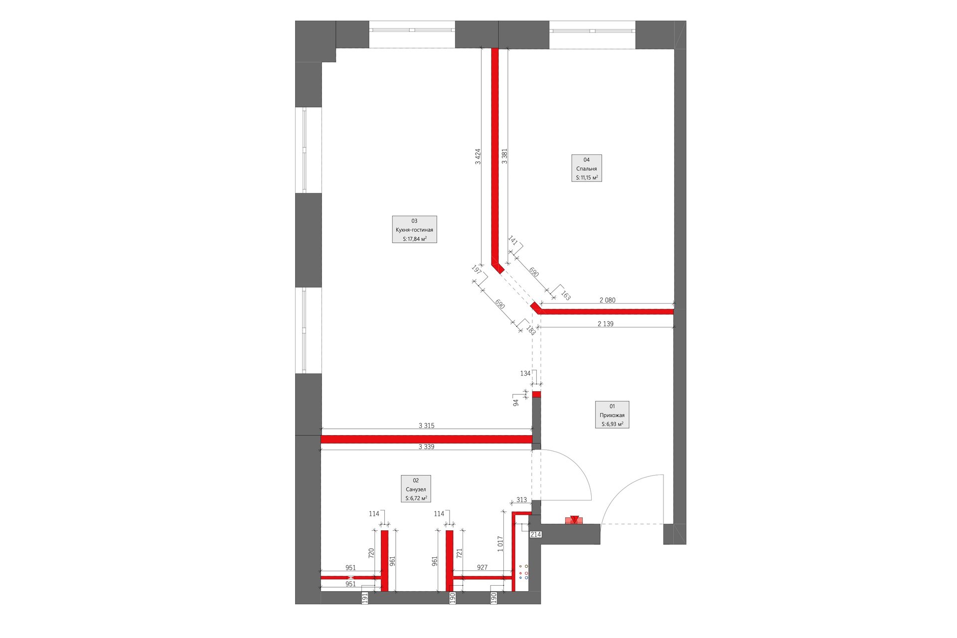 На момент покупки в квартире был устаревший ремонт в темных тонах и перепланировка, сделанная предыдущими владельцами. Чтобы пространство отвечало требованиям заказчицы, вход в спальню перенесли, выстроили ниши для шкафов в спальне и прихожей, убрали лишние перегородки в санузле. Расположение мокрых точек не меняли.